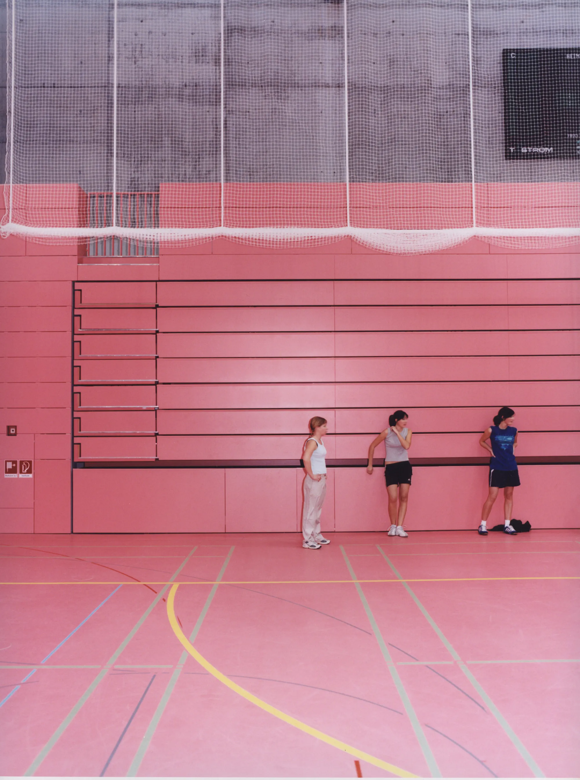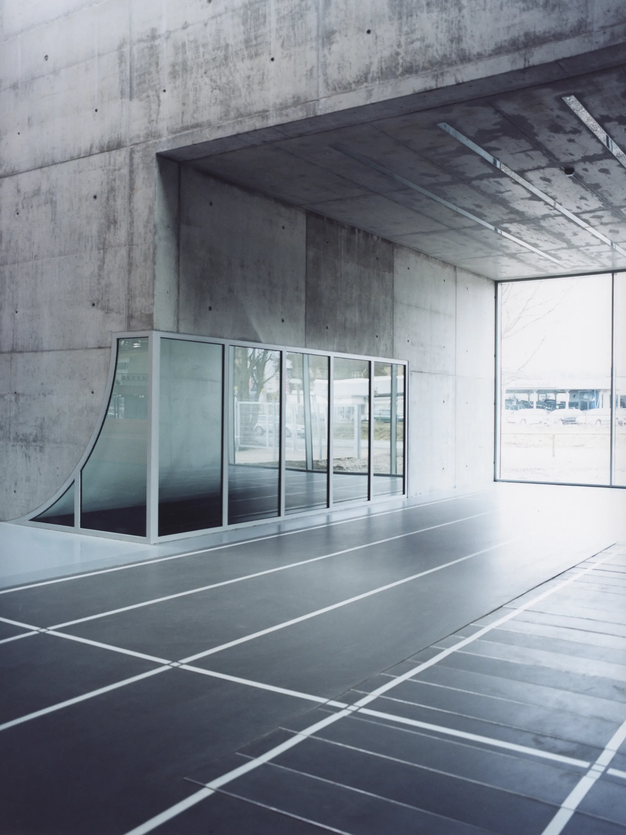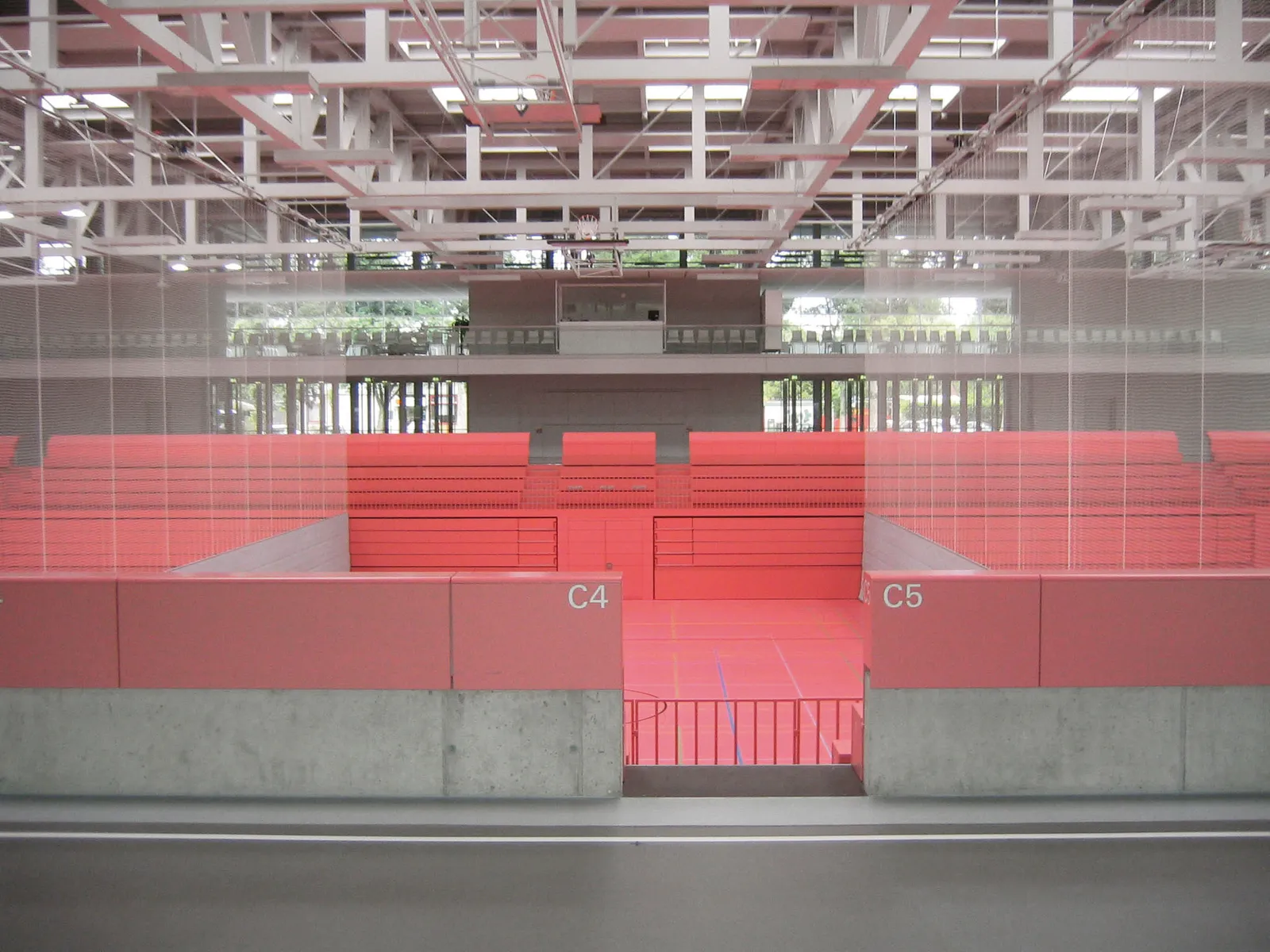 Der Heterogenität in der äußeren Erscheinung wird ein homogener Innenraum entgegengesetzt: ein magentafarbenes, monochromes Futteral für die zentrale Sport- und Veranstaltungsfläche mit einer Umfassung aus rohen Betonwänden. Ein für Sporthallen außergewöhnliches, natürliches Lüftungskonzept ergänzt zusätzlich zur Photovoltaik-Fassade den ganzheitlich nachhaltigen Ansatz des architektonischen Konzepts.