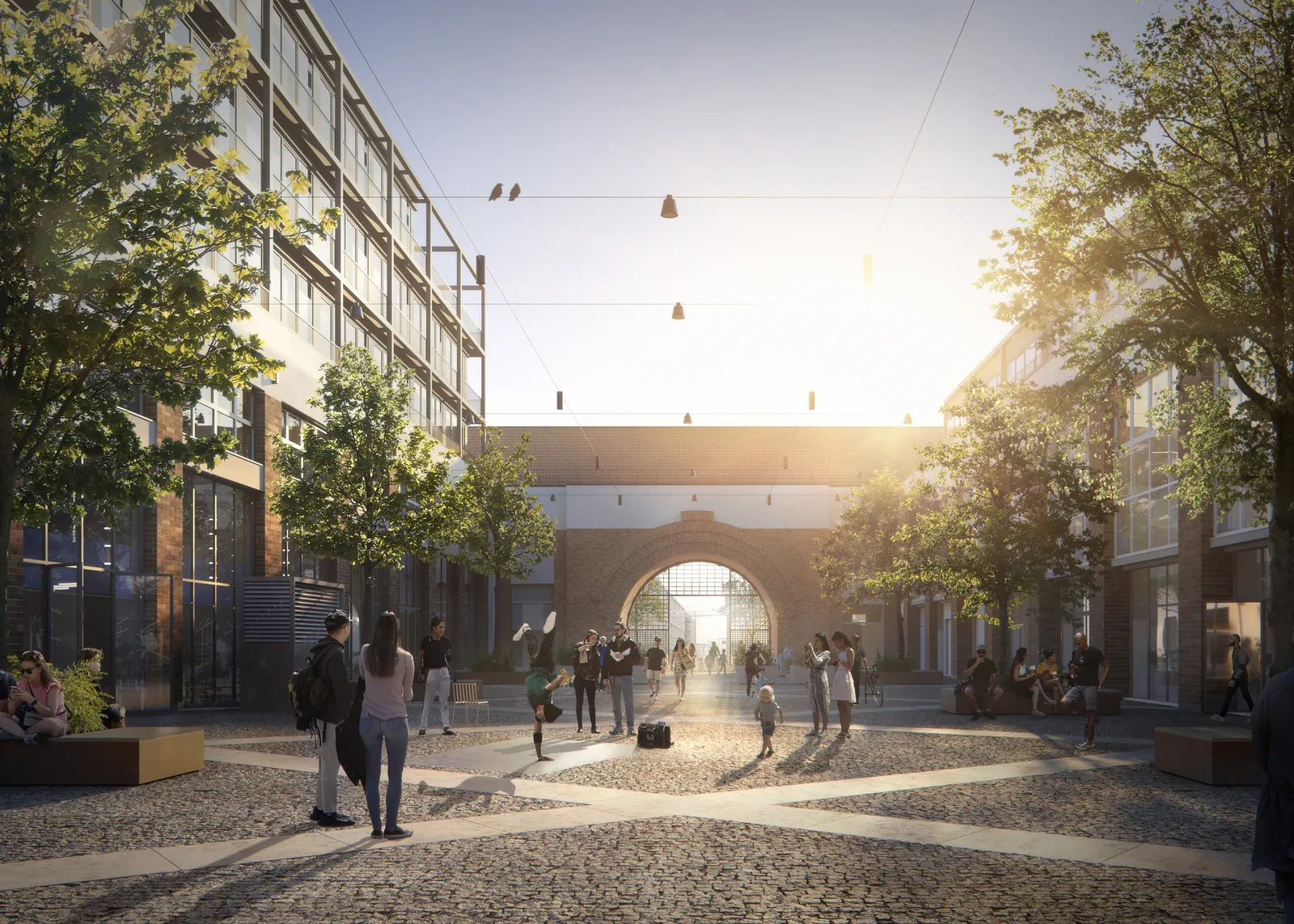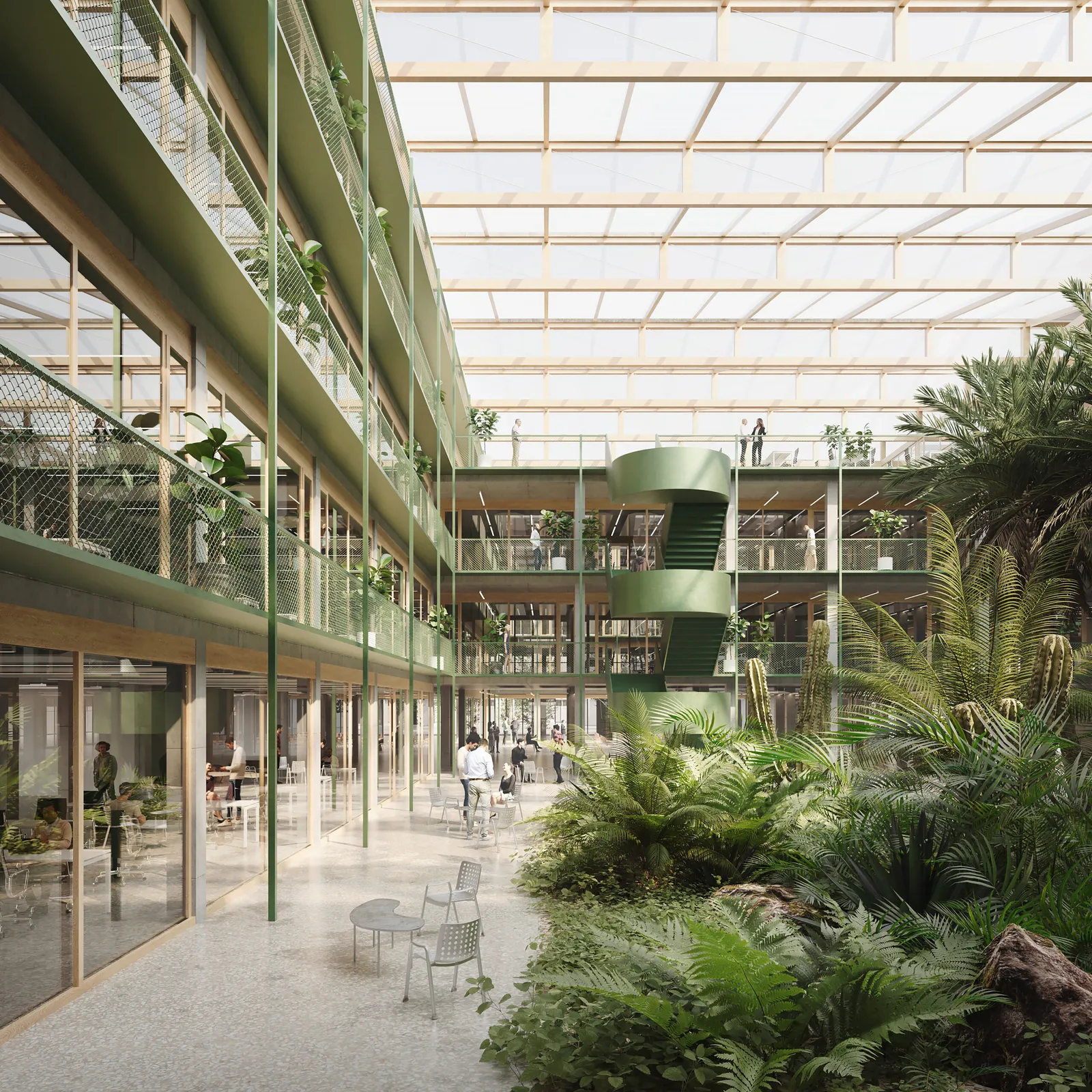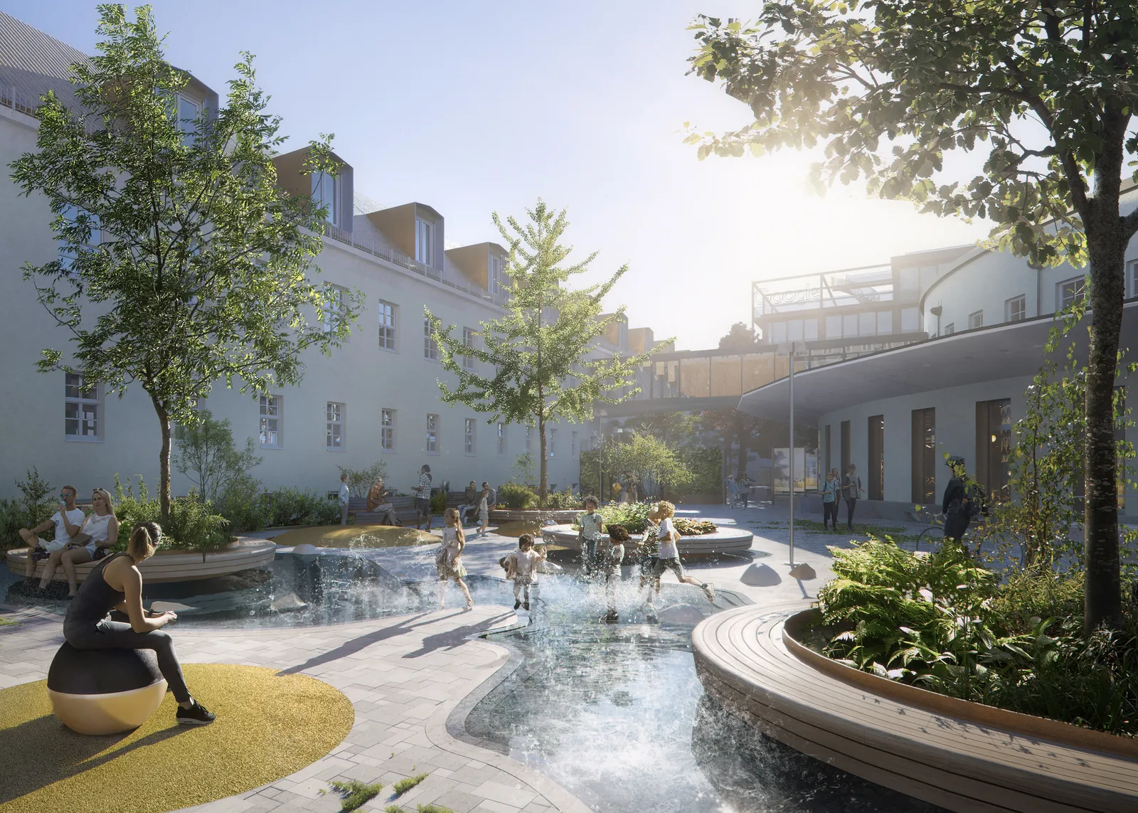 By adding timber construction, performative facades and greenery, the 1970s stock is converted into a flexible playable urban building block with public areas.