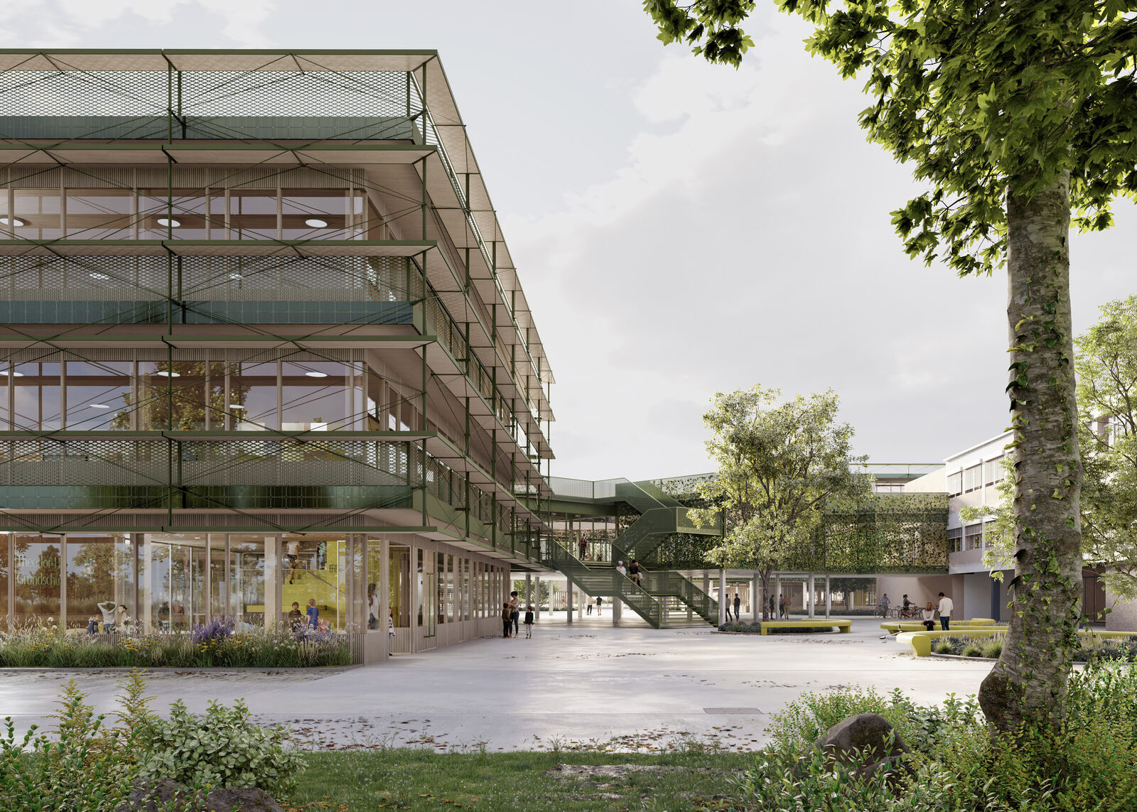 Accompanied by research projects on zero-waste construction, we develop concepts for circular construction methods in our projects. Hand in hand with our timber construction engineers, we investigate the topic of circularity as in the case of school construction Campus-Ost from the documentation of all components in a component catalogue to the elaboration of the details.