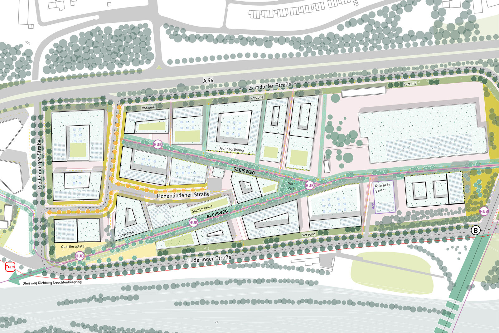Three overarching open space structures will be introduced to provide the area with green space and strengthen climate resilience. The Steinhauser Ring is ecologically charged and the Hultschiner clasp is developed as a connecting element between different green and open space structures. In addition, there is the use of the track as an internal networking structure with high-quality living areas and publicly accessible open spaces.