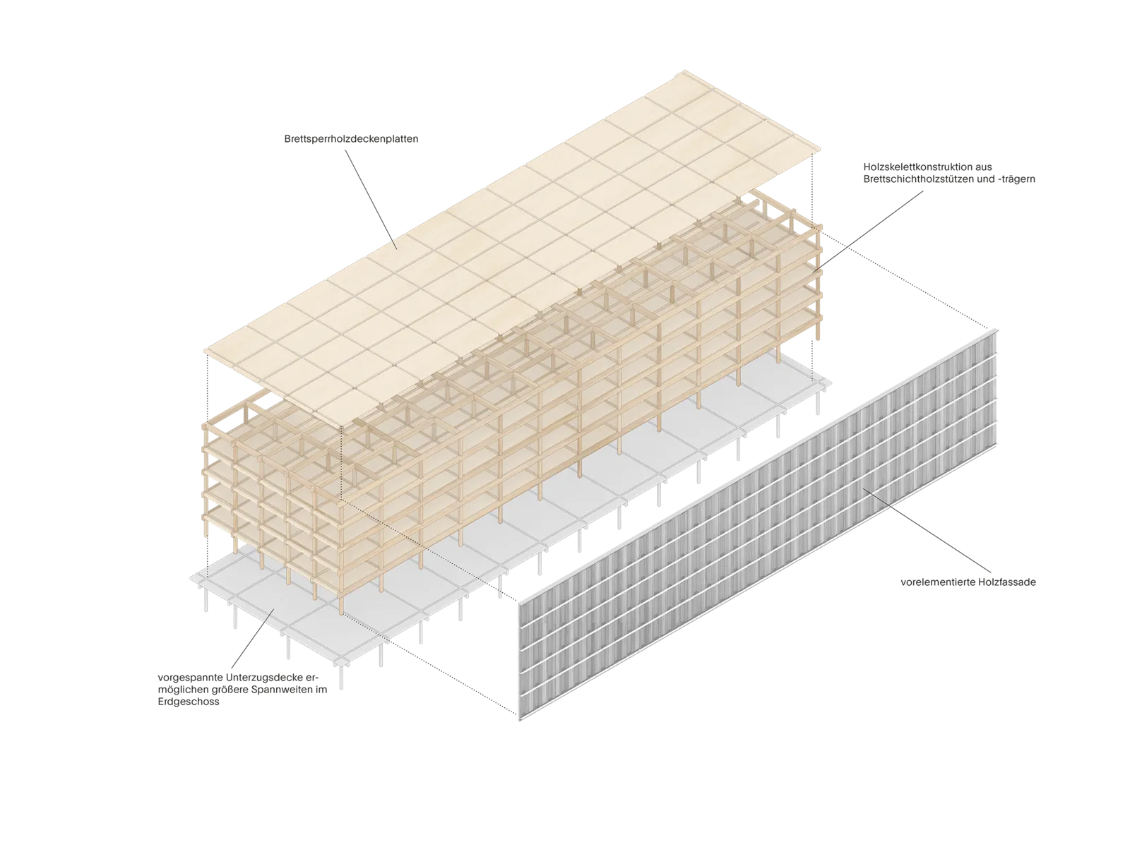 A building consists of 3 basic modules that are connected to each other by external access elements. The neutral basic module is designed as an optimized and flexible control module; the structural clarity achieved in this way gives the buildings the flexibility to adapt to changing spatial concepts. The supporting structure is planned as a multi-storey timber hybrid construction, with the new arrival center largely dispensing with a substructure; a basement is only planned in a sub area. The basement floors are constructed using recycled concrete, the upper floors as a wooden construction.
