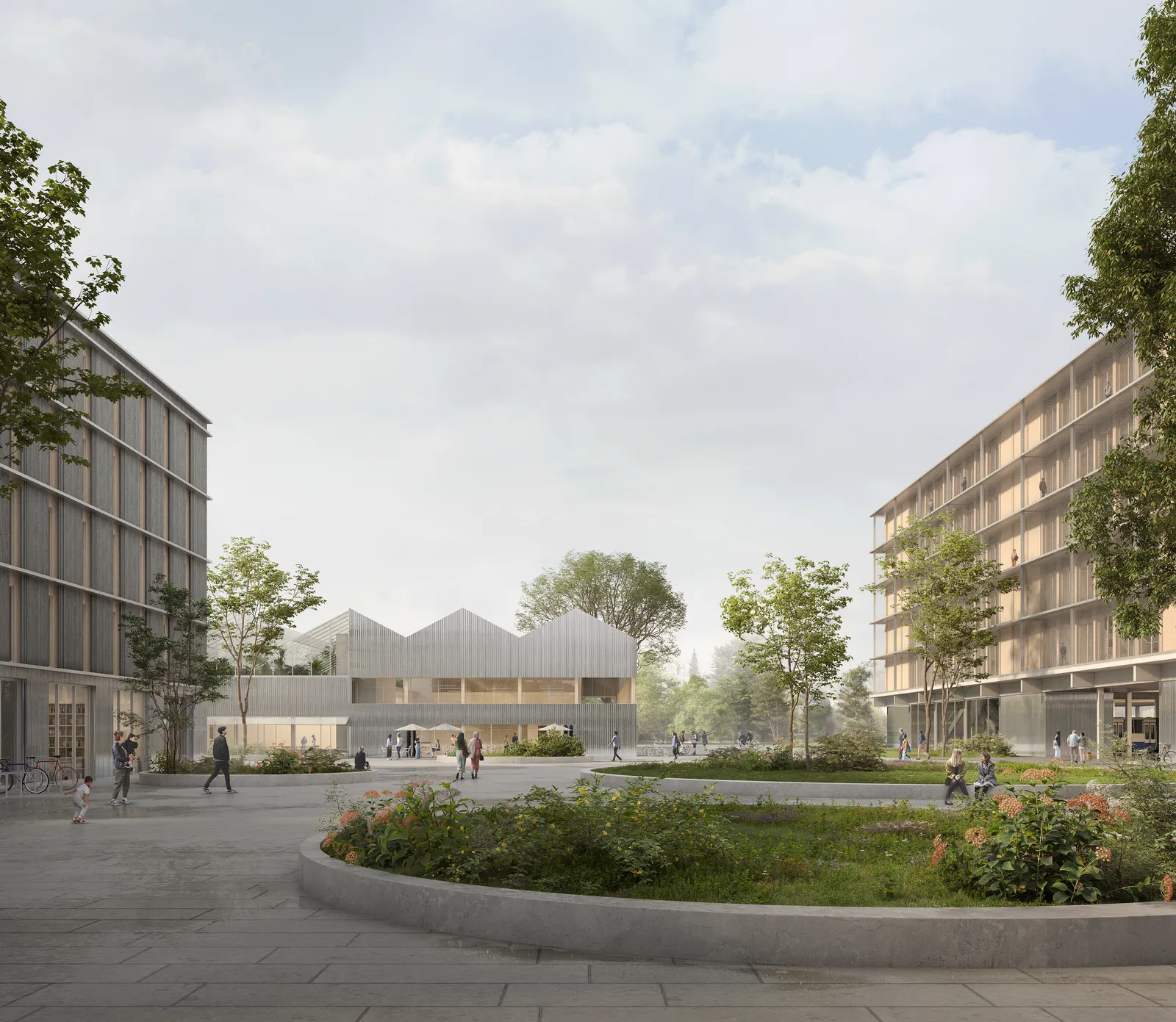 The accommodation area is the beating heart with a green center and a play forest at the kindergarten, while the traffic-calmed square at the arrival center acts as a mediator between the accommodation and processing areas. Spacious tree islands with insect meadows serve as a meeting zone for residents and visitors to the neighborhood.