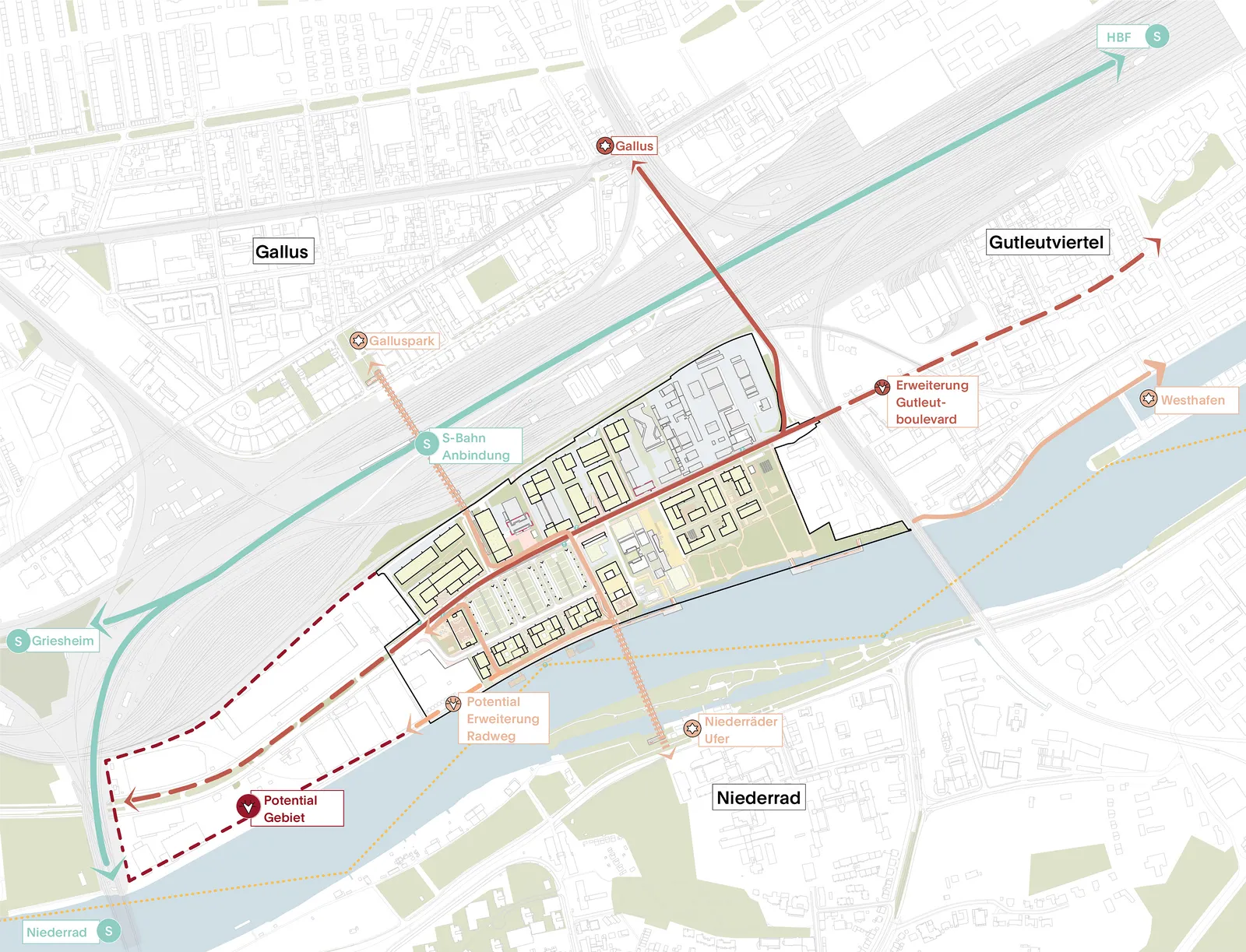 The design created in the dialogue process aims to initiate a long-term development of the Gutleut-Areal. The Gutleut-Areal is located on the north bank of the River Main, bordering the stations district to the east, Griesheim to the west and Gallus and the tracks of the main railway station to the north. The area therefore benefits from a central location and offers great potential for development.