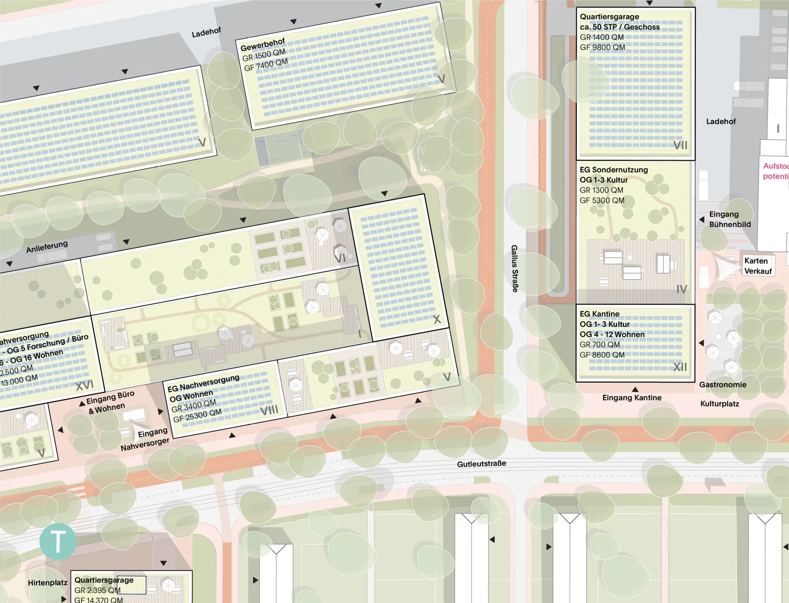 The usage cluster with a commercial focus is trying to establish different offers for different users. The buildings should be able to accommodate flexible commercial forms mainly through hybrid space offers. Special attention must be paid in the design of the building law to secure spaces for service industries and crafts. Moreover, the critical mass for local supply of the area can be reached via residential blocks. Cultural, social and educational building blocks complement the usage cluster.