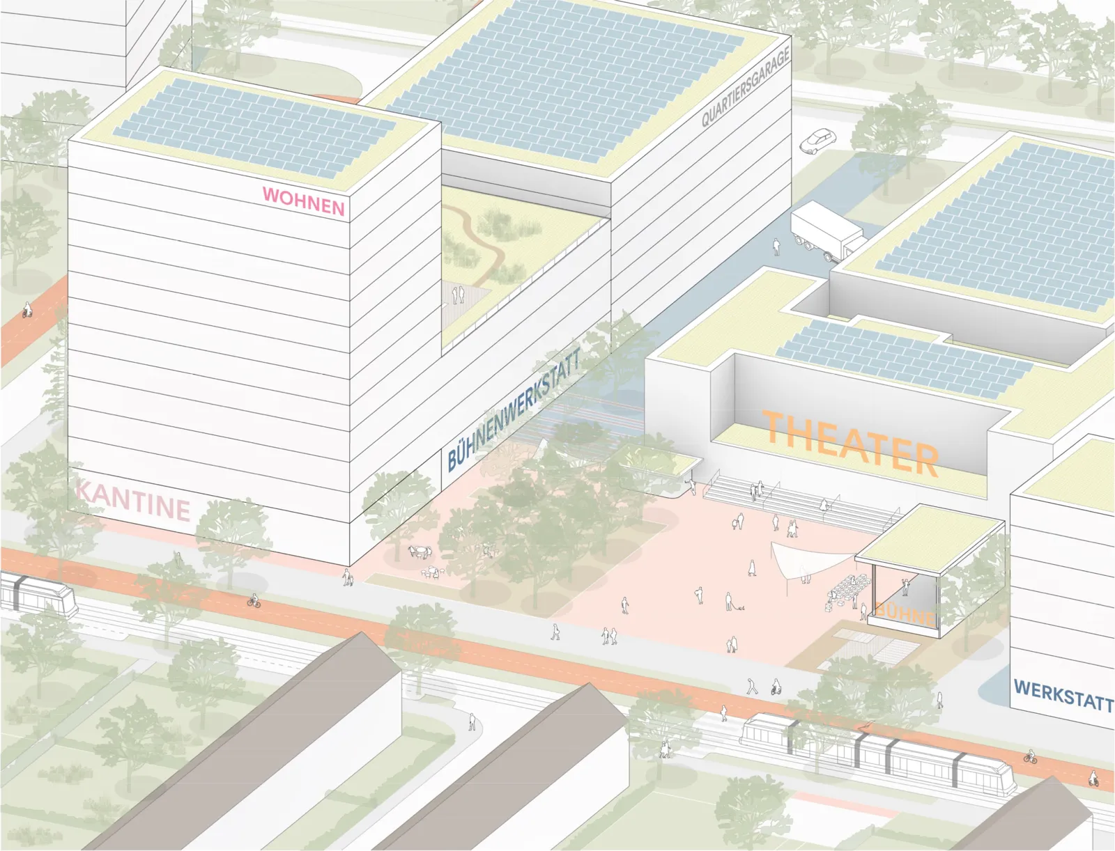 In order to strengthen identification with the new urban quarter identity-forming places must be created. We are using the potential of the existing buildings. The Gutleuthafen and cultural center with the theater building block, the Hirtenplatz with its striking new high point and the Sommerhoffpark in connection with the Milchsackareal form a network of identity-creating places that connect the industrial character with new and existing open spaces.