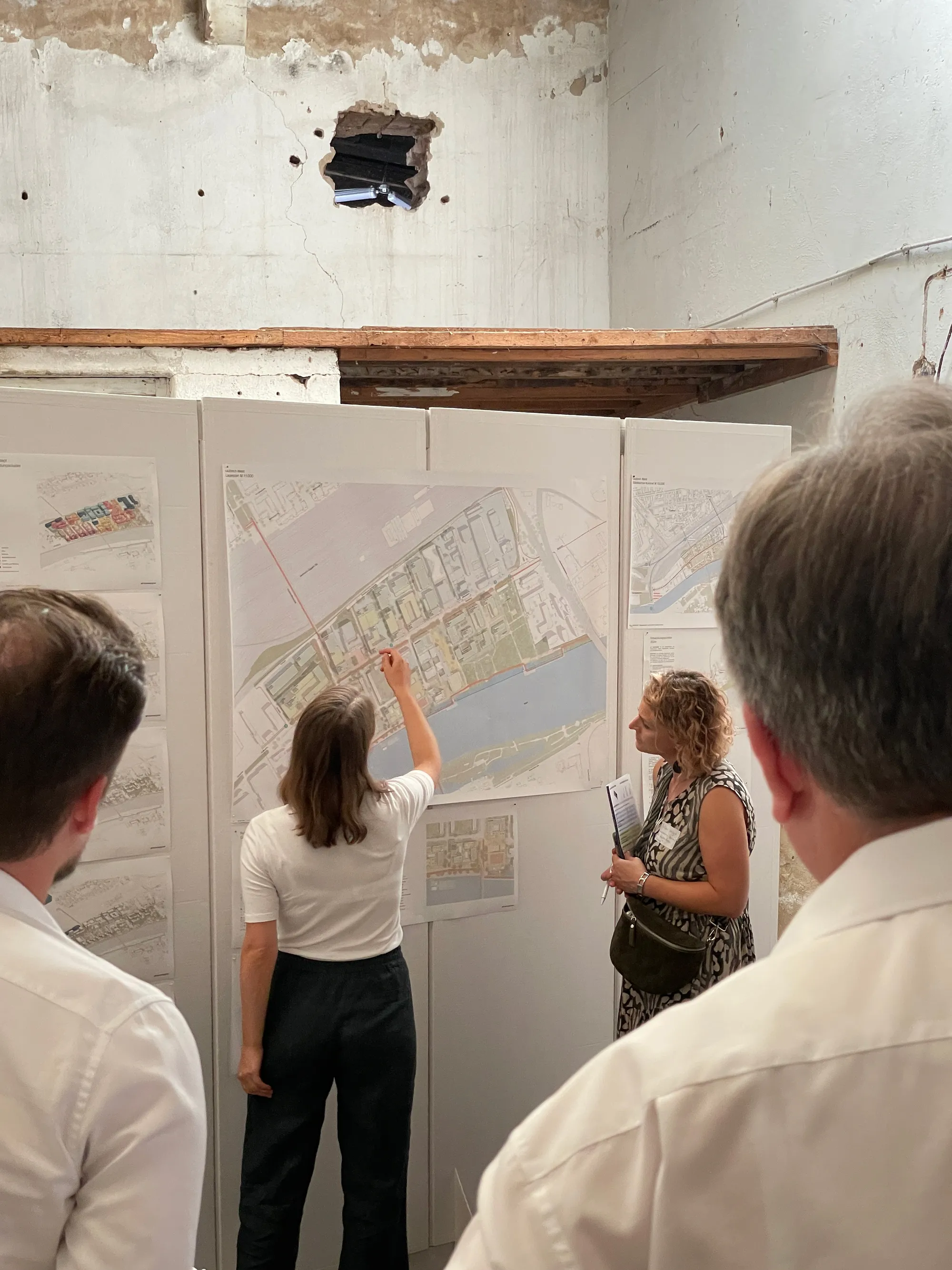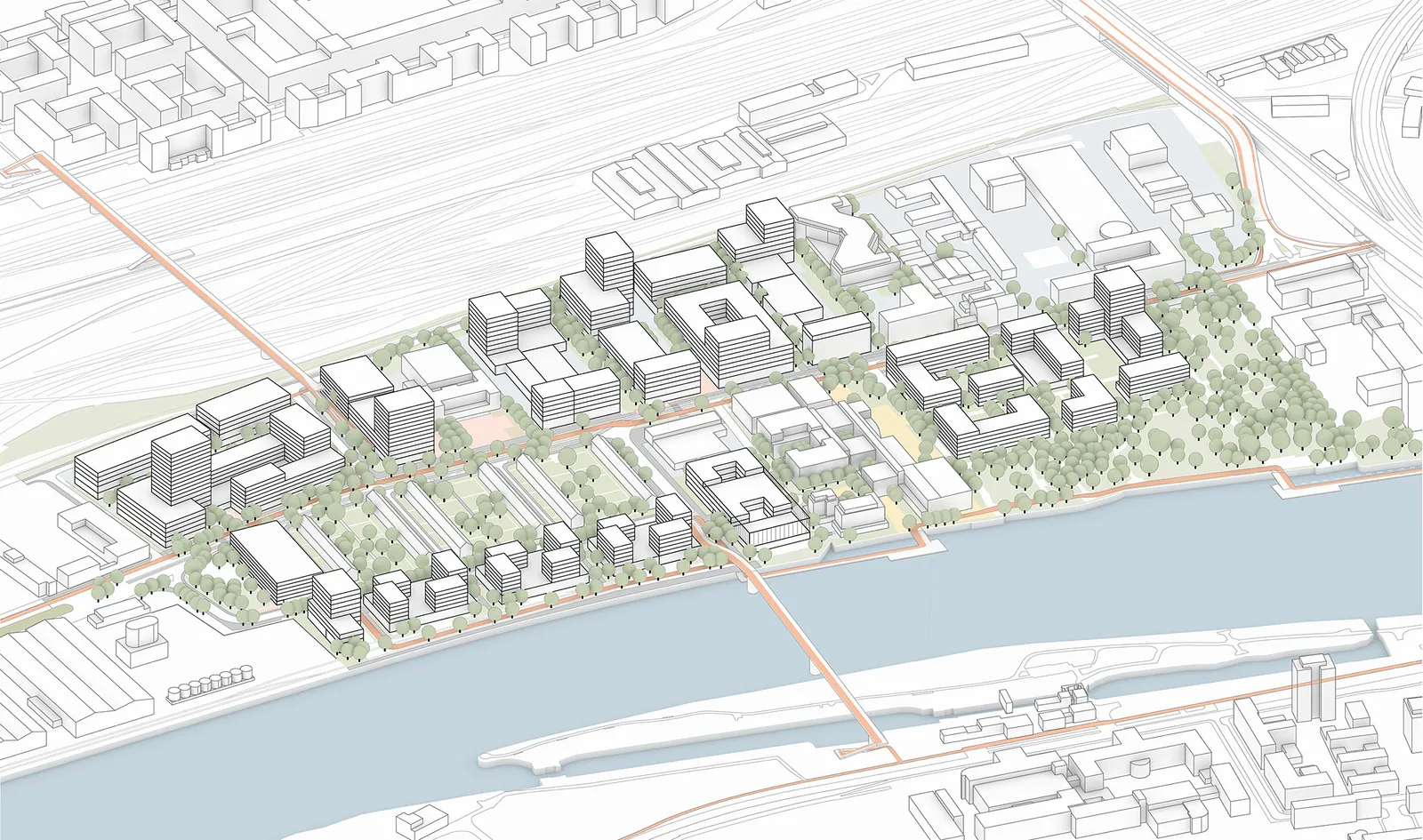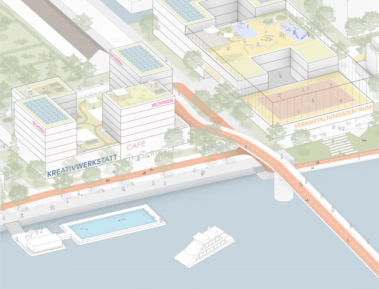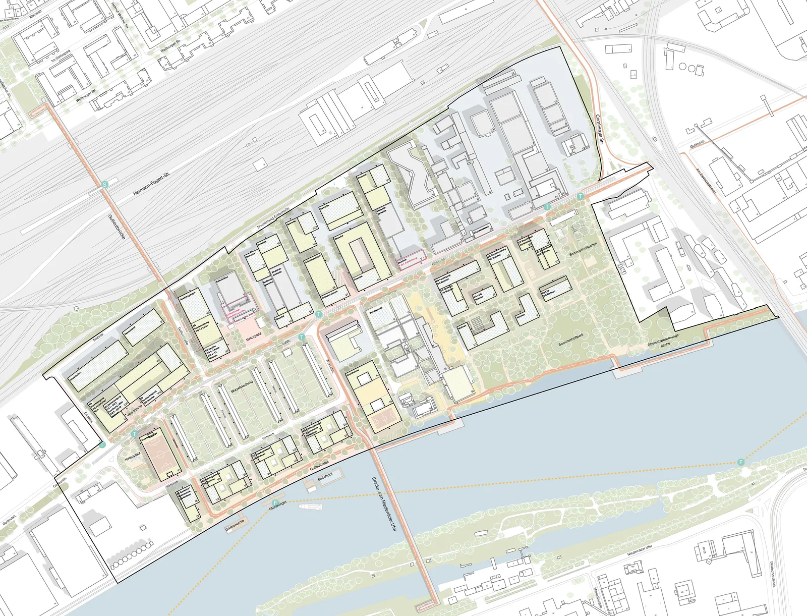 The plans envisage a gradual transformation of the area. In a first step, brownfield sites will be developed as a stimulus. Parking areas as well as the waterfront will be made accessible to residents. In subsequent development stages, existing buildings will be further developed, individual building blocks will be demolished, new commercial and cultural activities will be established, and public transport will be expanded to include bus, streetcar, S-Bahn and ferry services. Creative and residential space will be created. New bridges over the river and rails will ensure good connections to the district.