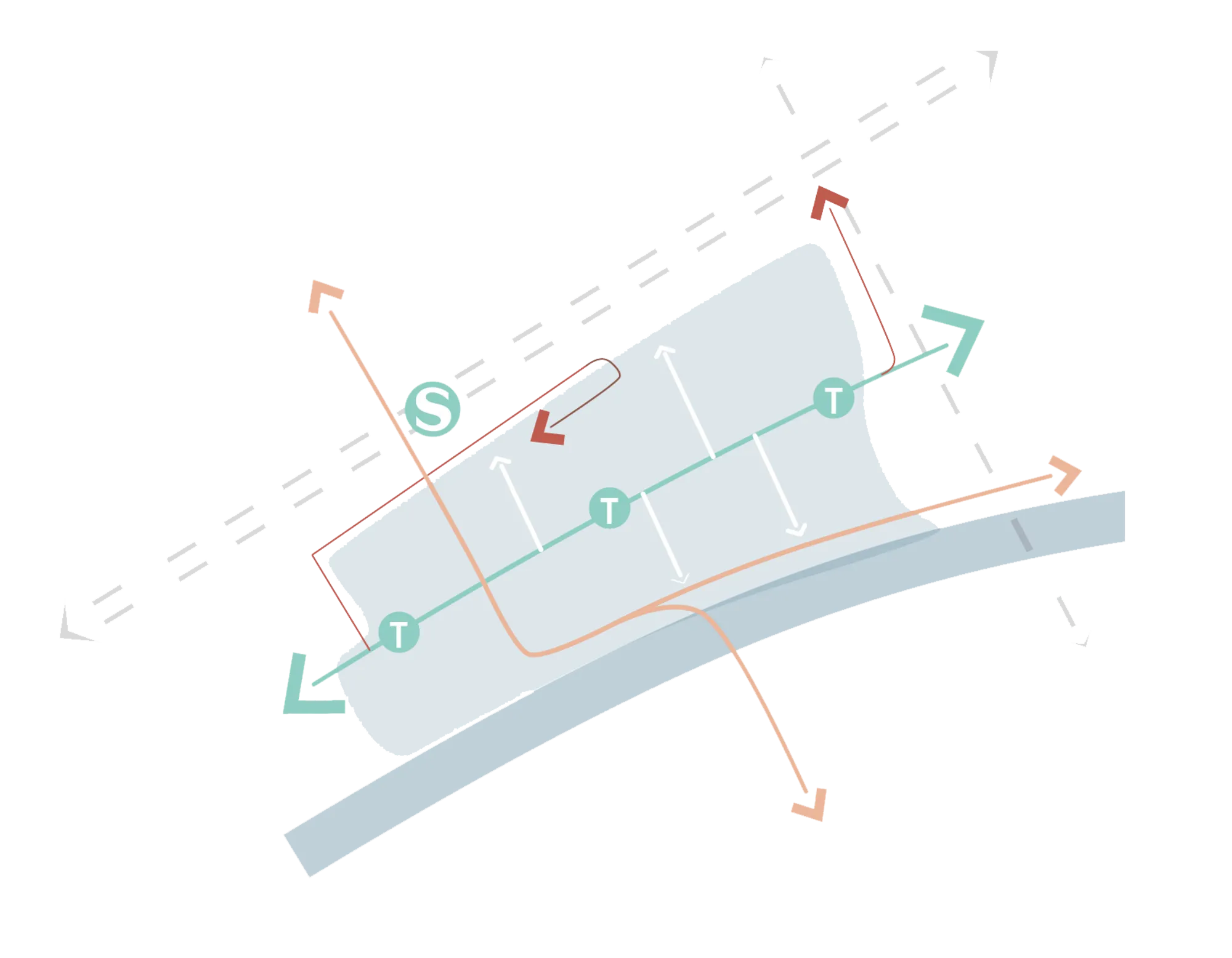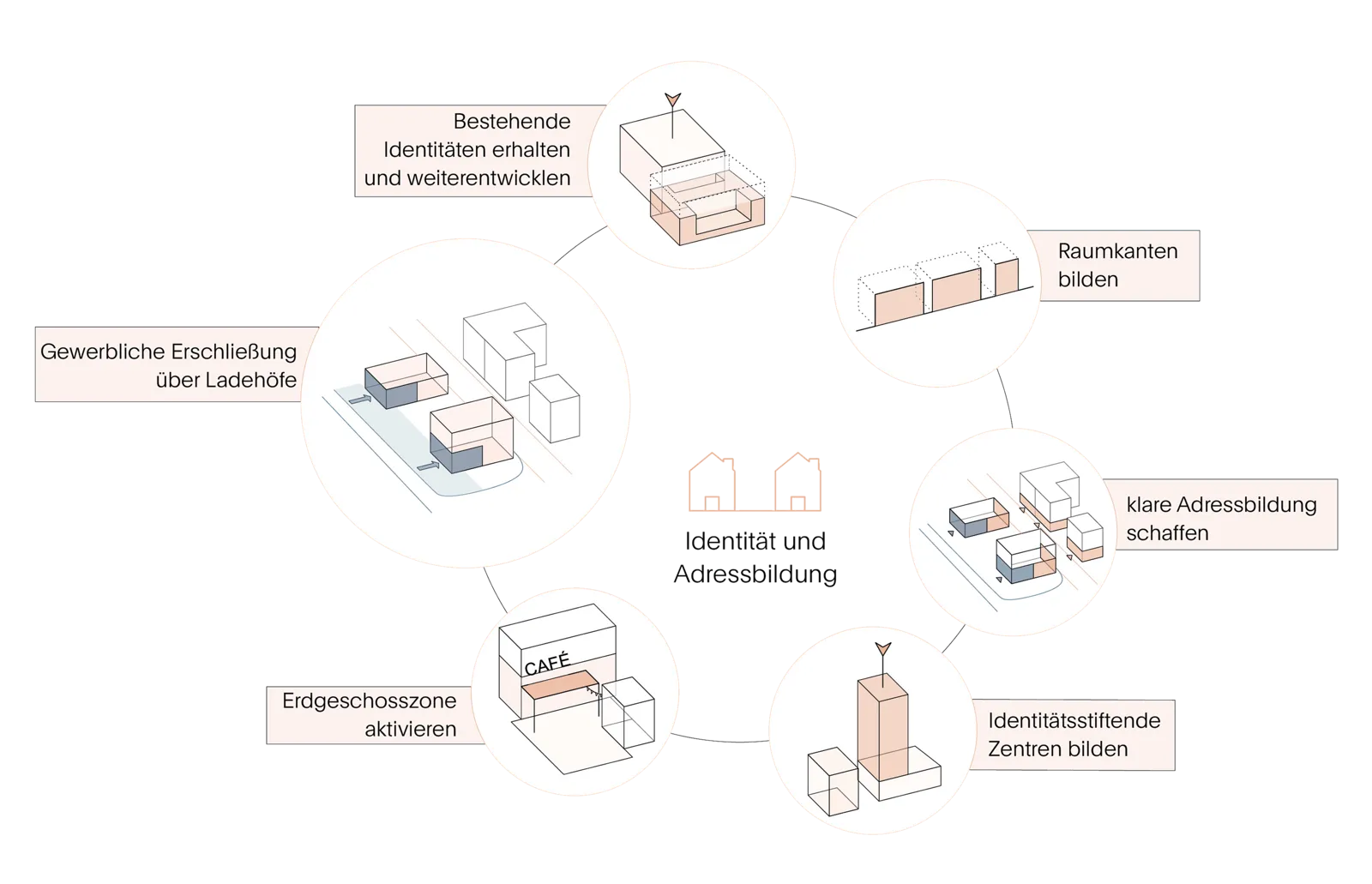 Existing identity-forming building blocks will be preserved and further developed. New centers for art, gastronomy, the waterfront and parking areas will create new spaces for exchange and social interaction. The individual building blocks are given a clear address and will have a space-forming effect. Commercial development will be separated from the public via charging stations, allowing for high-quality open space development towards the street.