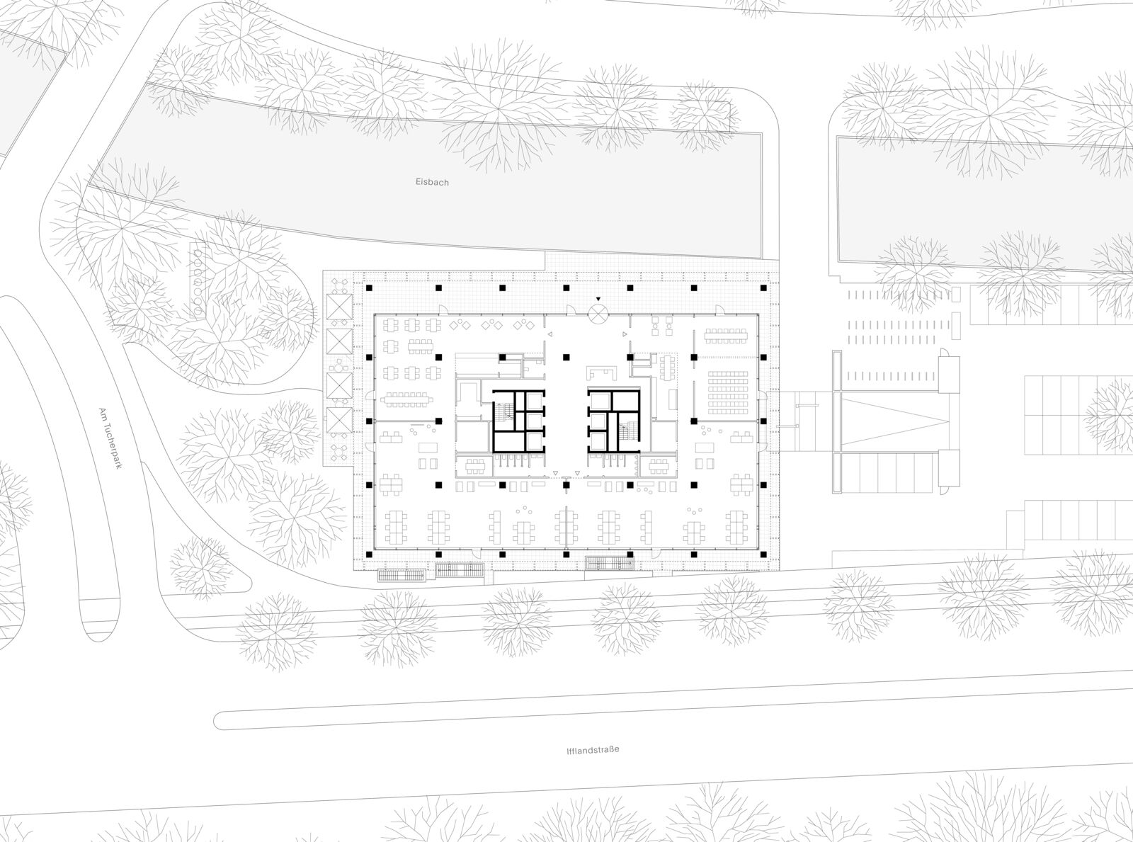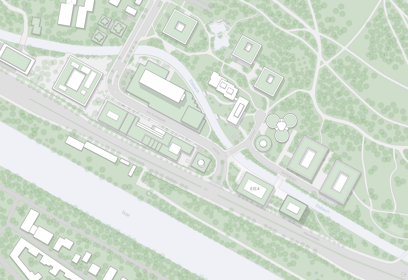 Tucherpark, a unique, green office development along the English Garden designed by Sep Ruf in the 1960s, is now registered as an ensemble in the Bavarian list of monuments. The building 'Am Eisbach 4' – EIS 4 – which he designed in 1969, is located on one of the properties and is a defining element of the 'Tucherpark' ensemble and an outstanding example of Sep Ruf's structural design approach.