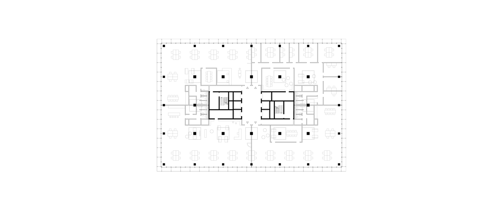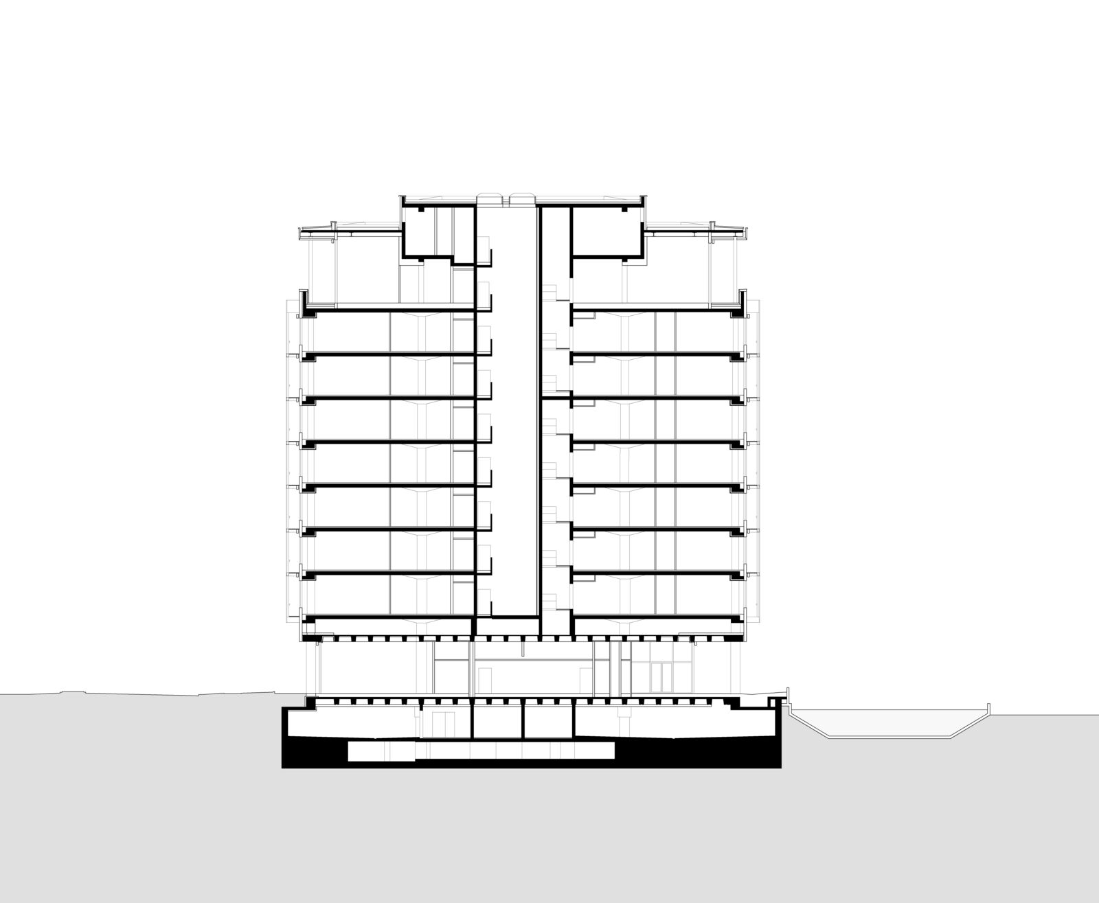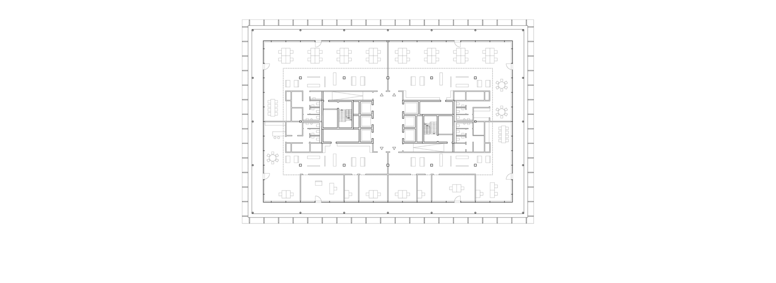 Above the 7th floor, the existing technical floor will be dismantled and reorganized and reinterpreted with an innovative lightweight construction with a surrounding roof terrace for additional office use.