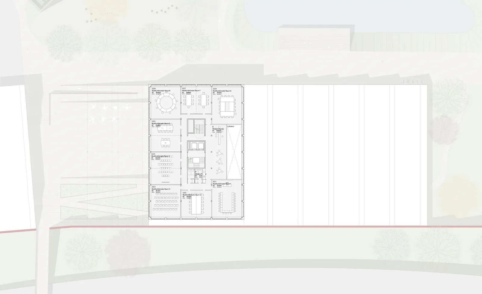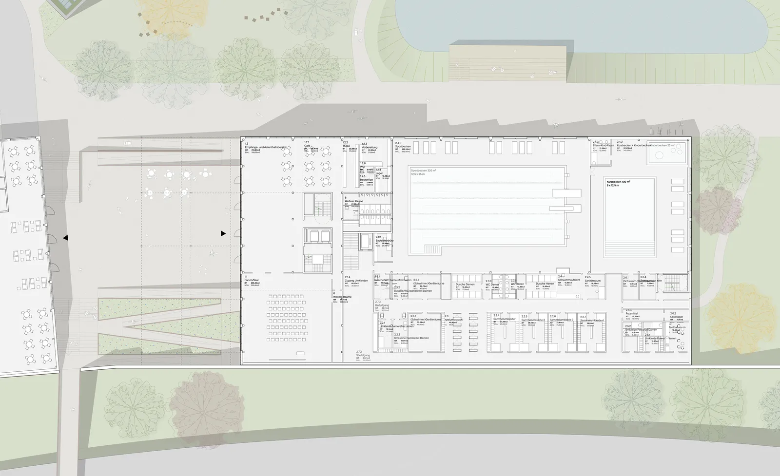 Both open spaces complement each other functionally and atmospherically: the spacious promenade not only serves as a central access axis for pedestrians and cyclists, but its design also invites visitors to linger and stroll. The entrances to the swimming pool and the clubhouse/academy, as well as the academy's creative rooms and innovation laboratory, are open to visitors and invite them to enter.