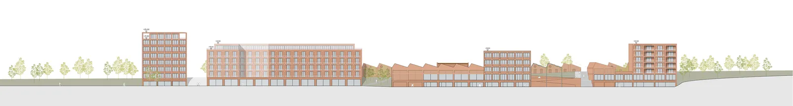 The design picks up on the materiality of the historic shed façade and, through the use of bricks, creates a harmonious overall appearance that is typical of the location. The new buildings are linked by similar materials. A continuous, generously designed plinth along the promenade and a structuring brick façade on the upper floors form connecting architectural elements that visually unite the ensemble. At the same time, the differentiated design of the façade panels allows for flexible adaptation to the respective use.