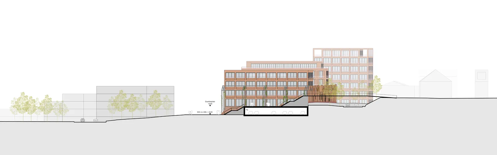 The footbridge over the B51 provides optimal access to the city centre for pedestrians and cyclists. Attractive ramps connect the different levels of the neighbourhood and enable barrier-free access. A publicly accessible lift in the foyer of the Rhombus Campus makes it easier for people with limited mobility in particular to access the neighbourhood square level. The transition from the promenade to the neighbourhood square is inviting and fluid in design.
