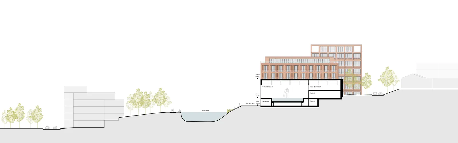 The design of the climate lake includes the integration of an embankment in the southern area. The gentle transition to the water not only creates a habitat for aquatic animals and birds in the reeds, but also integrates the planned recreation area. A retaining wall will be integrated on the northern shore, which will form an attractive element in the open space as a seating step directly at the water's edge and at the same time serve as a technical element for retention during heavy rainfall events. This allows the lake to absorb additional water at short notice and makes an important contribution to flood protection in the neighbourhood.