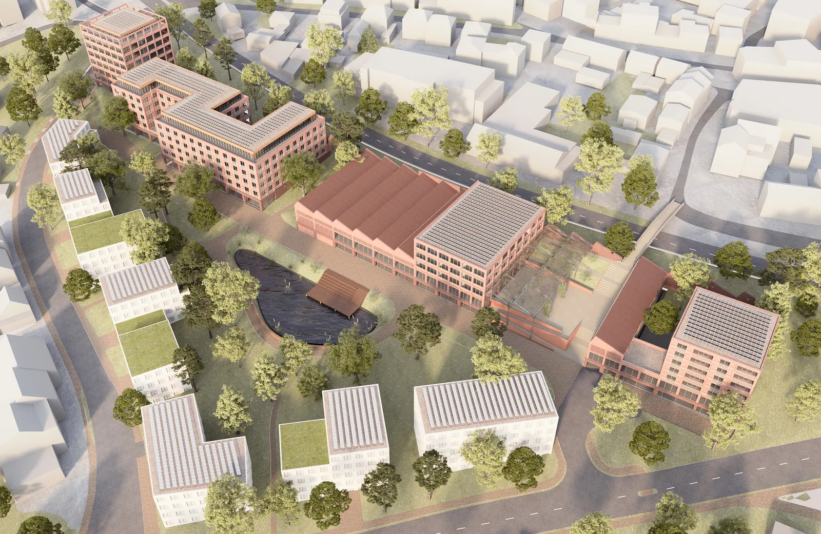 Building on the present study, the concept specifies the open space design and development structure of the quarter – including a promenade, neighbourhood square and climate lake – as well as the urban design of central buildings such as the health tower, senior care facility, Rhombus Campus and Innovation House. The aim is to significantly improve the quality of life and create a lively, mixed-use neighbourhood with a wide range of uses.
