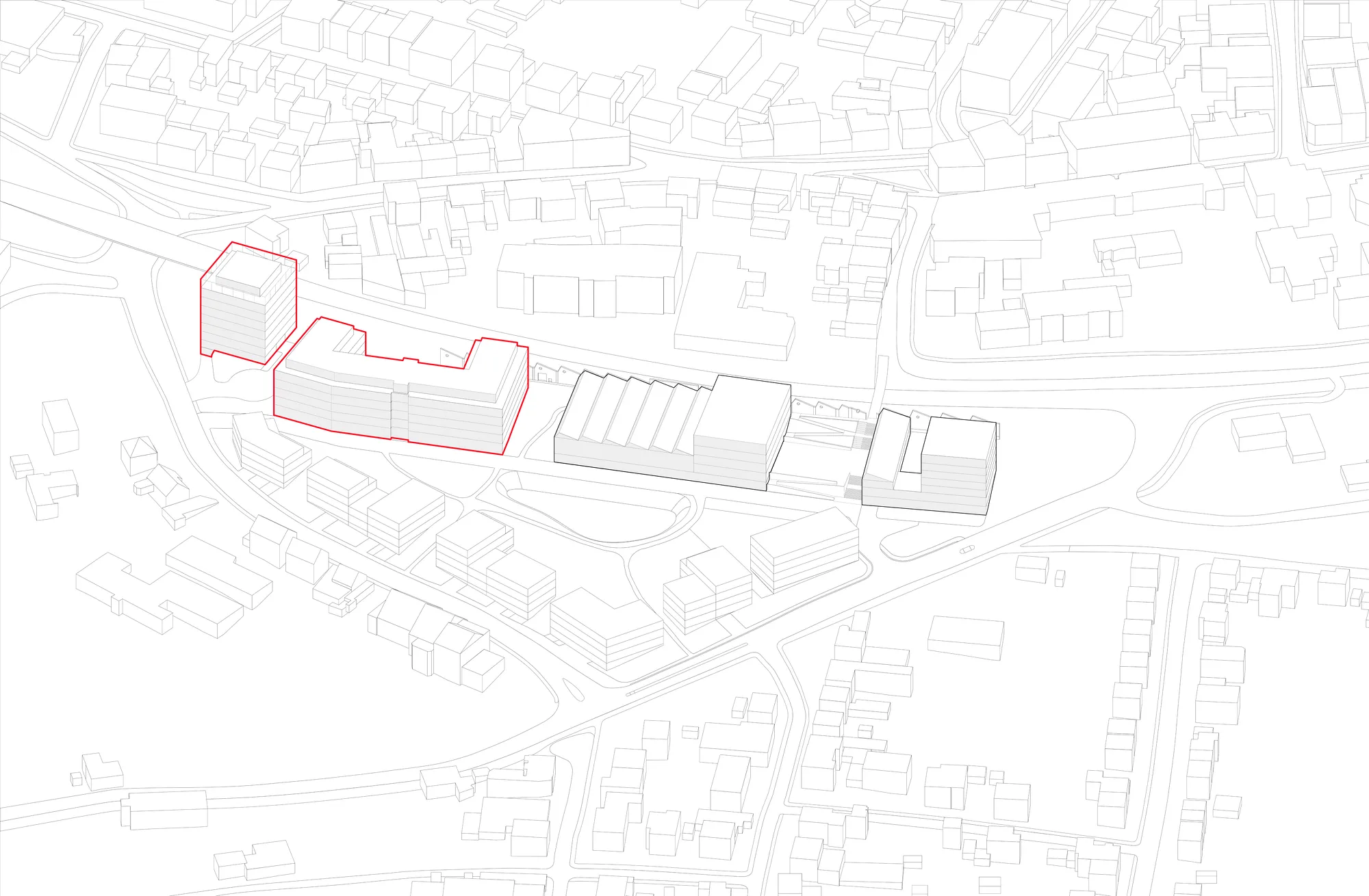 To break up the long façade of the senior care facility along the promenade, a meandering building structure with projections and recesses is proposed. This ensures a varied façade design both towards the promenade and the residential buildings opposite. The new building meets the requirements of the space allocation plan in terms of bed numbers and living space. The health tower also meets the requirements of the space allocation plan. A slight rotation allows it to blend more harmoniously into the overall structure of the senior care facility, Rhombus Campus and Innovation House. The Rhombus Campus forms the central building block of the innovation quarter and is intended to serve as a ‘lighthouse’ project for Wermelskirchen. The original building volume can be implemented on the private property without restricting development on the public area.