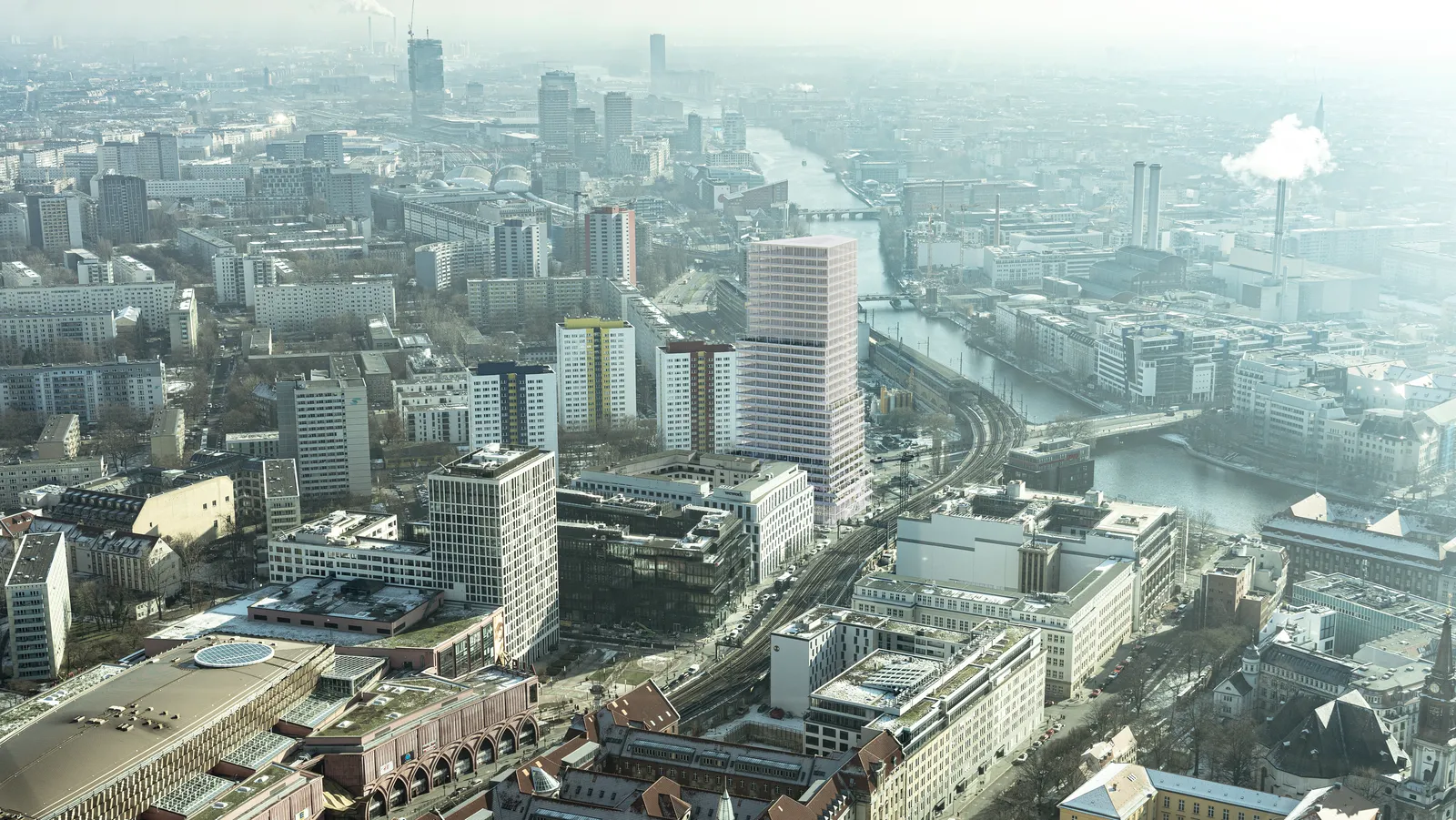 The building addresses the urban context and presents itself as a new type of climate-adapted skyscraper. Its unique design incorporates energy-efficient features such as photovoltaic panels and flexible interiors that foster a sense of openness and interconnectedness with the surrounding city skyline.