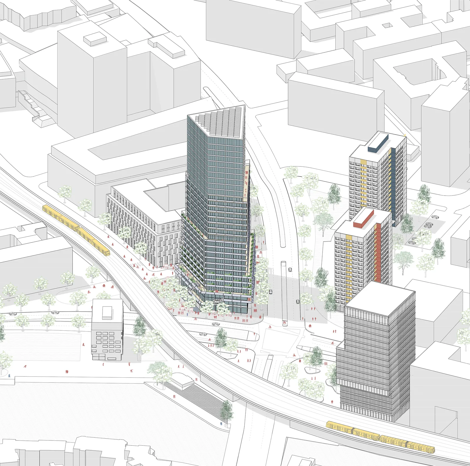 In terms of urban planning, the tower´s stepped setbacks interact with the surroundings and offer attractive open spaces as well as visual connections to nearby roads.