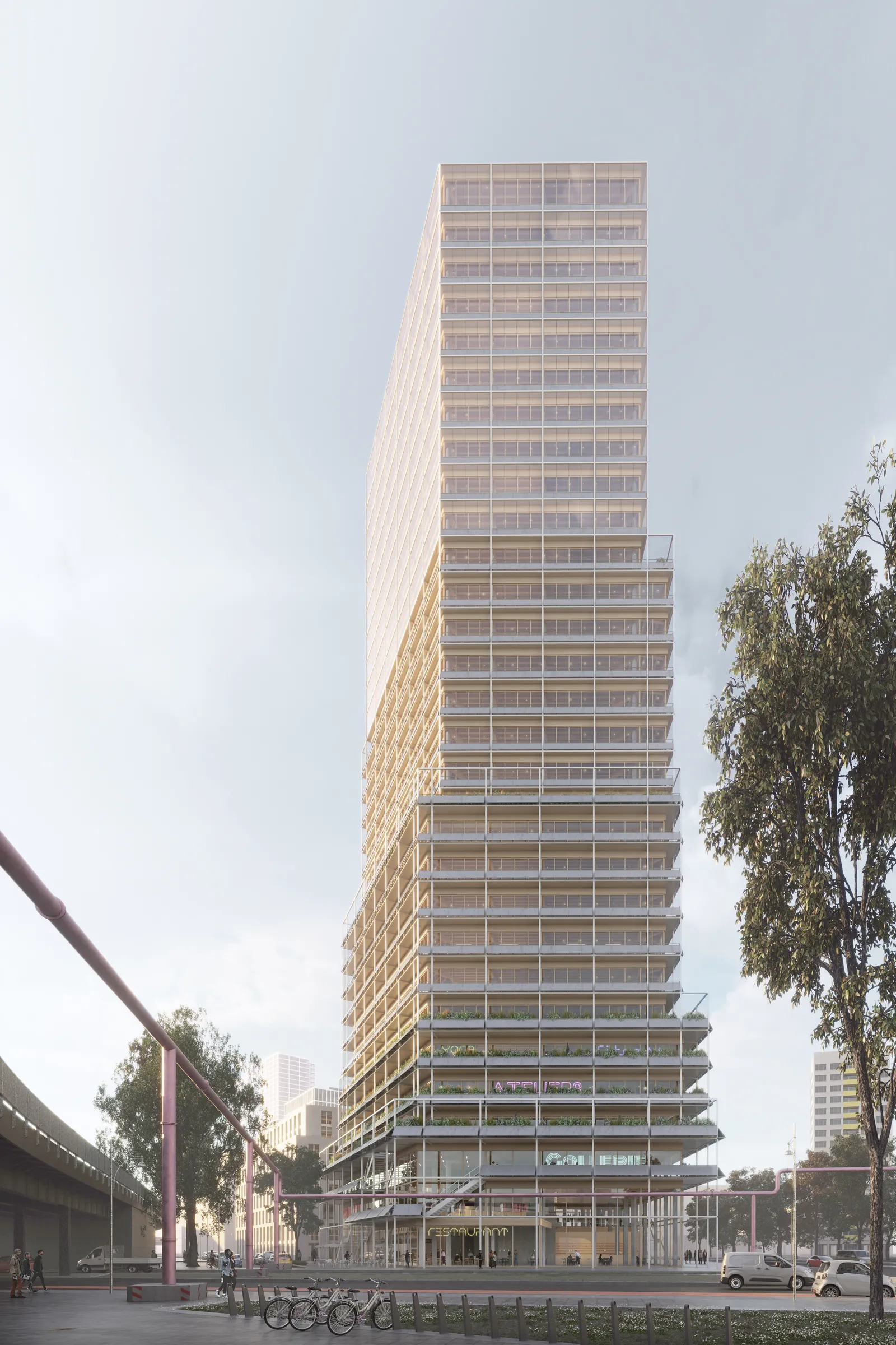 The façade reflects a resilient and adaptable scaffolding that accommodates photovoltaic panels, green spaces and public amenities and is distributed over its entire height. The use concept of the building follows a multifunctional approach with a balanced distribution between commercial and non-commercial spaces to meet diverse community needs.