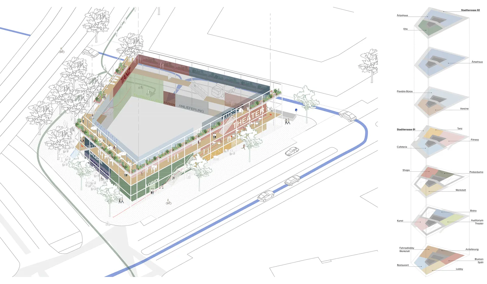 The focus is on sustainability, with particular attention to environmental, social and economic aspects. The construction of the building prioritizes resource efficiency and low emissions by using a hybrid structure and green roofs to increase energy efficiency and reduce environmental impact. In addition, the design promotes social inclusion through many public spaces and flexible design, while at the same time finding cost-effective solutions for long-term maintenance and operation.