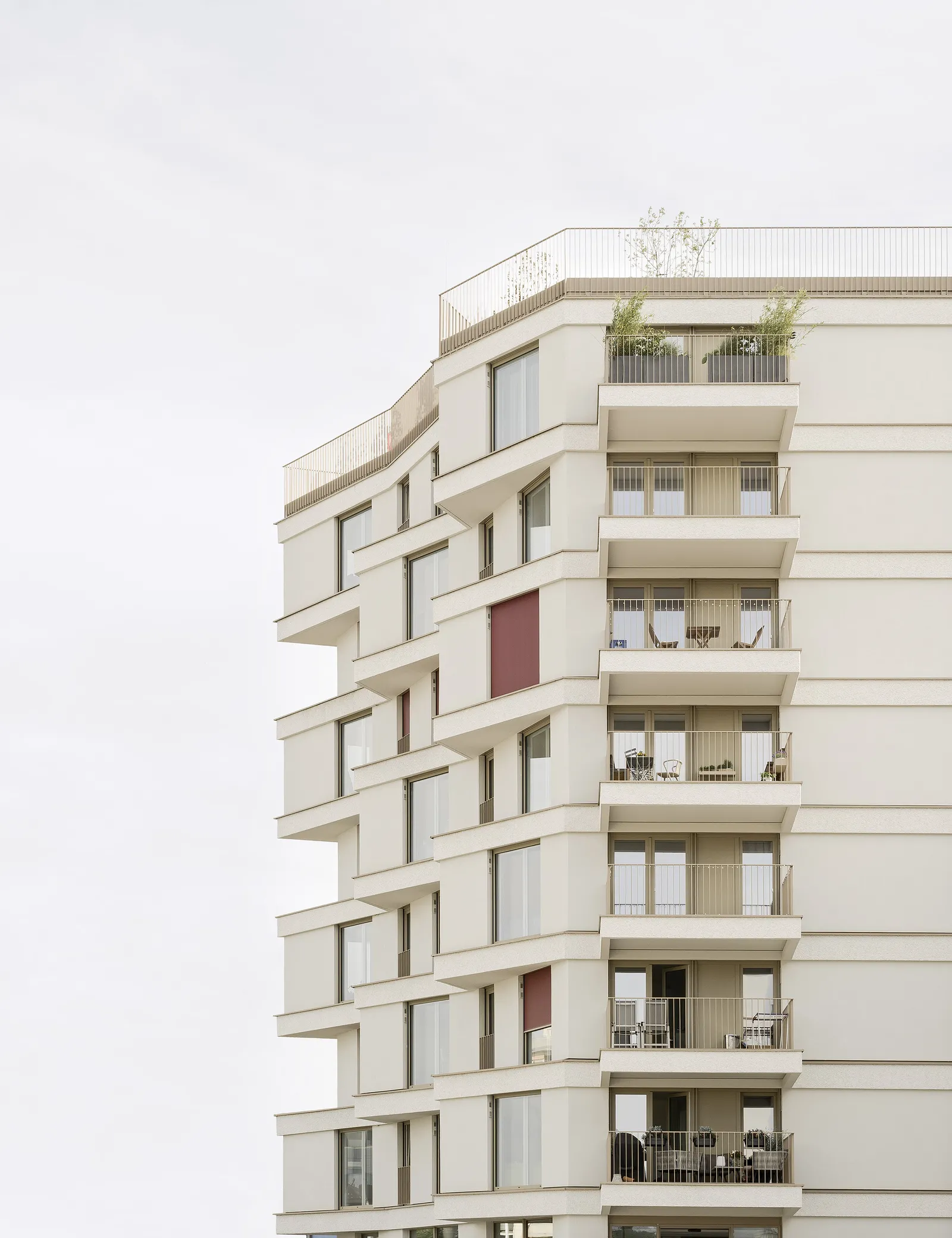 For the residents, the asymmetrical protruding alcoves expand the living space from within and provide 270-degree views of the cityscape. This enhances both the cosmopolitan flair of the apartments as well as the perceived sense of space.