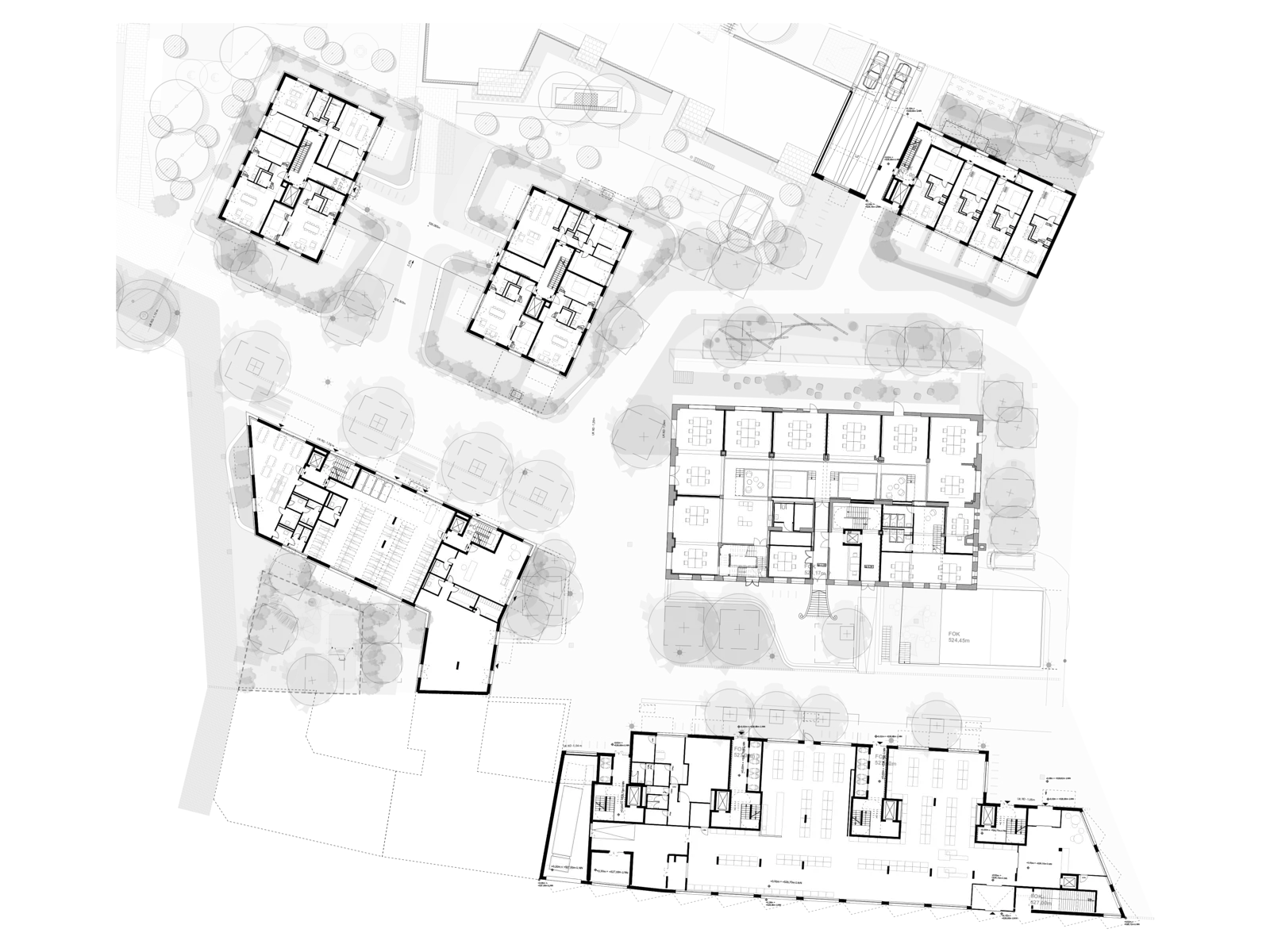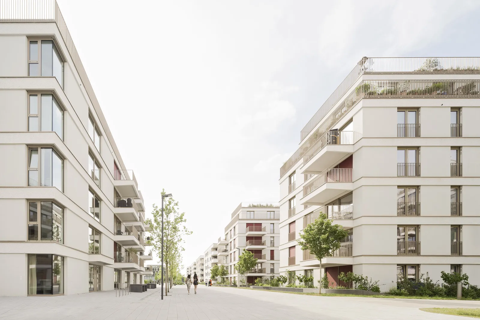 The exterior of the new buildings varies based on their orientation, facing either the rest of the complex or the street. All interior façades have a quiet, objective look and feel, while a pattern of bay window protrusions gives the urban-facing façades a more sculptural quality – and this striking frontage promises to become synonymous with the new neighborhood.