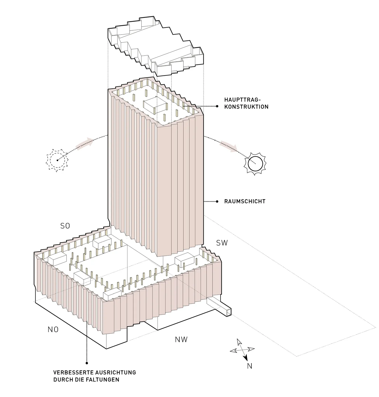 “Rocket & Tigerli” marks the last of the tallest buildings in the revitalization master plan. As perhaps its most striking attribute, the pleated folding of the façade evokes the corrugated metal roof of a production shed and flips it into the vertical. The layer of spaces jutting out at an angle give the high-rise its sculptural aspect. These alternating bay windows and balconies lend the façade depth, three dimensionality and an oscillating dynamic, which extends around the building’s corners in an intriguing way to create the perception of torsion. The pleated effect also increases the depth of the façade, making the photovoltaic modules even more efficient. The green-black, almost iridescent surface harks back to the color palette of the historic steam locomotives manufactured by “Tigerli”.