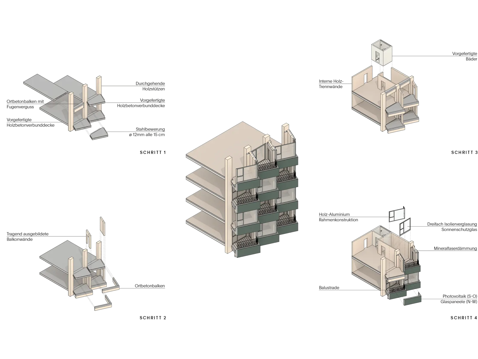The transitions from public to private spaces are designed with nuance. The wide range of outdoor spaces in particular provides opportunities for neighborly and community interaction into the future. The flat roof of the high-rise can serve as a rooftop bar open to the public, complete with sweeping views of the Alpine scenery.