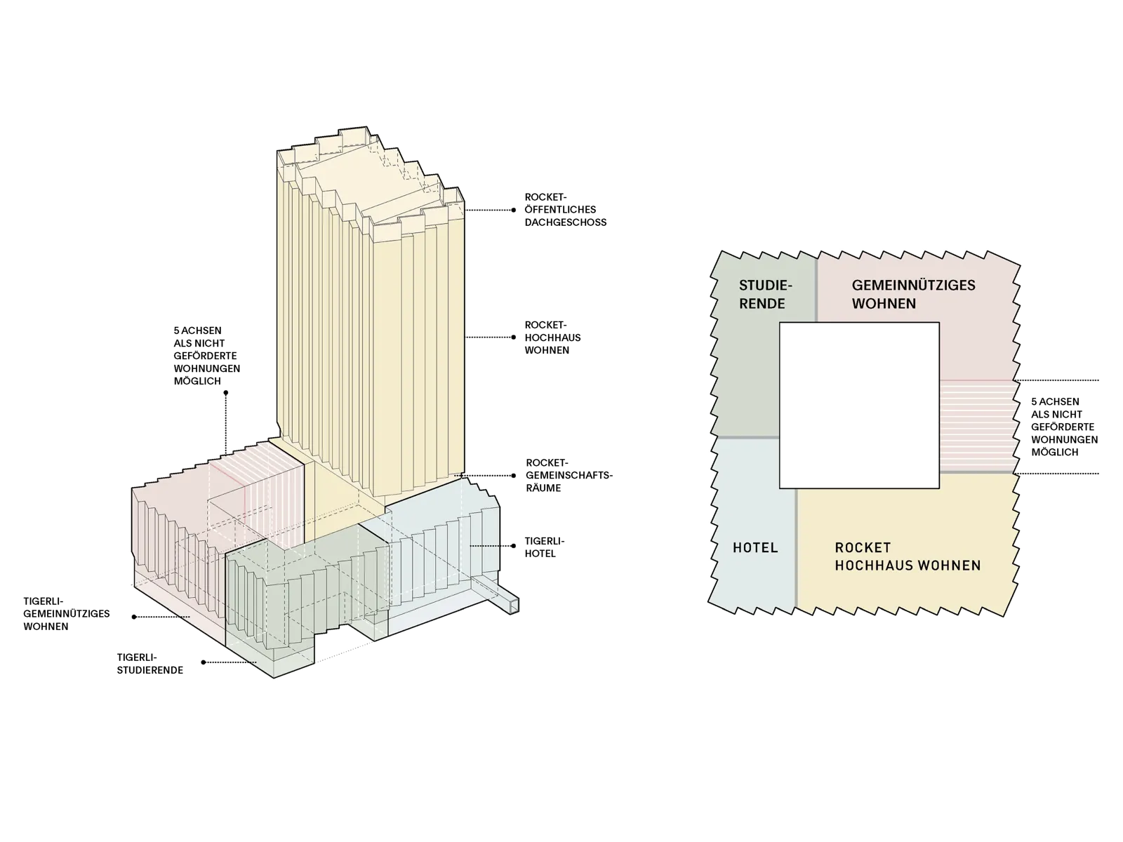 This is the spatial and structural context for the world’s tallest wooden skyscraper “Rocket & Tigerli”. In addition to the core mission to use sustainable construction methods, our aim is to create a landmark that is as context-driven as it is bold and as iconographic as it is inviting, one that makes the most of the area’s distinct characteristics.