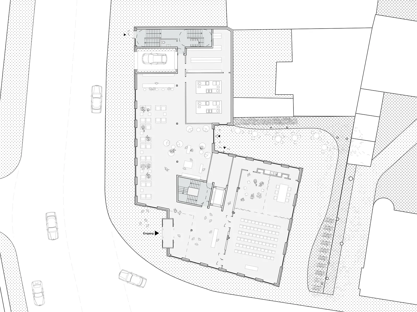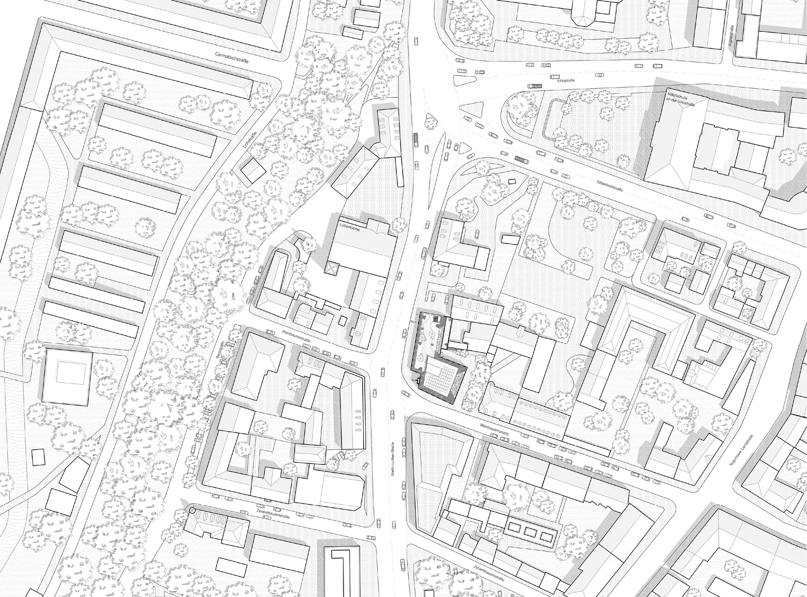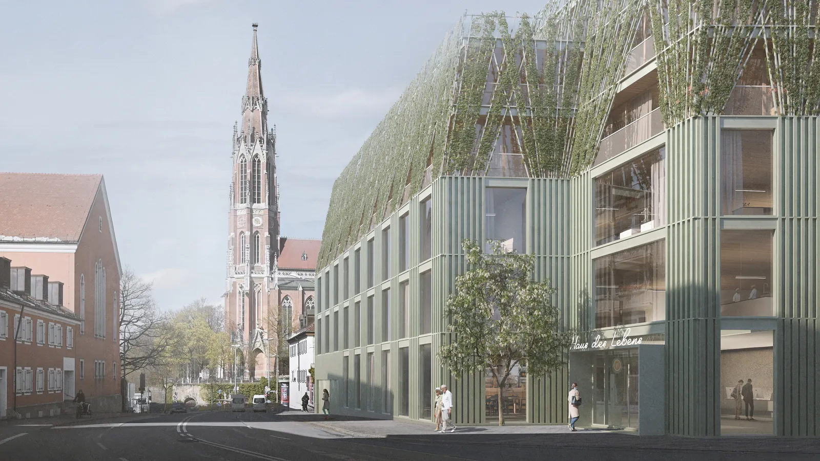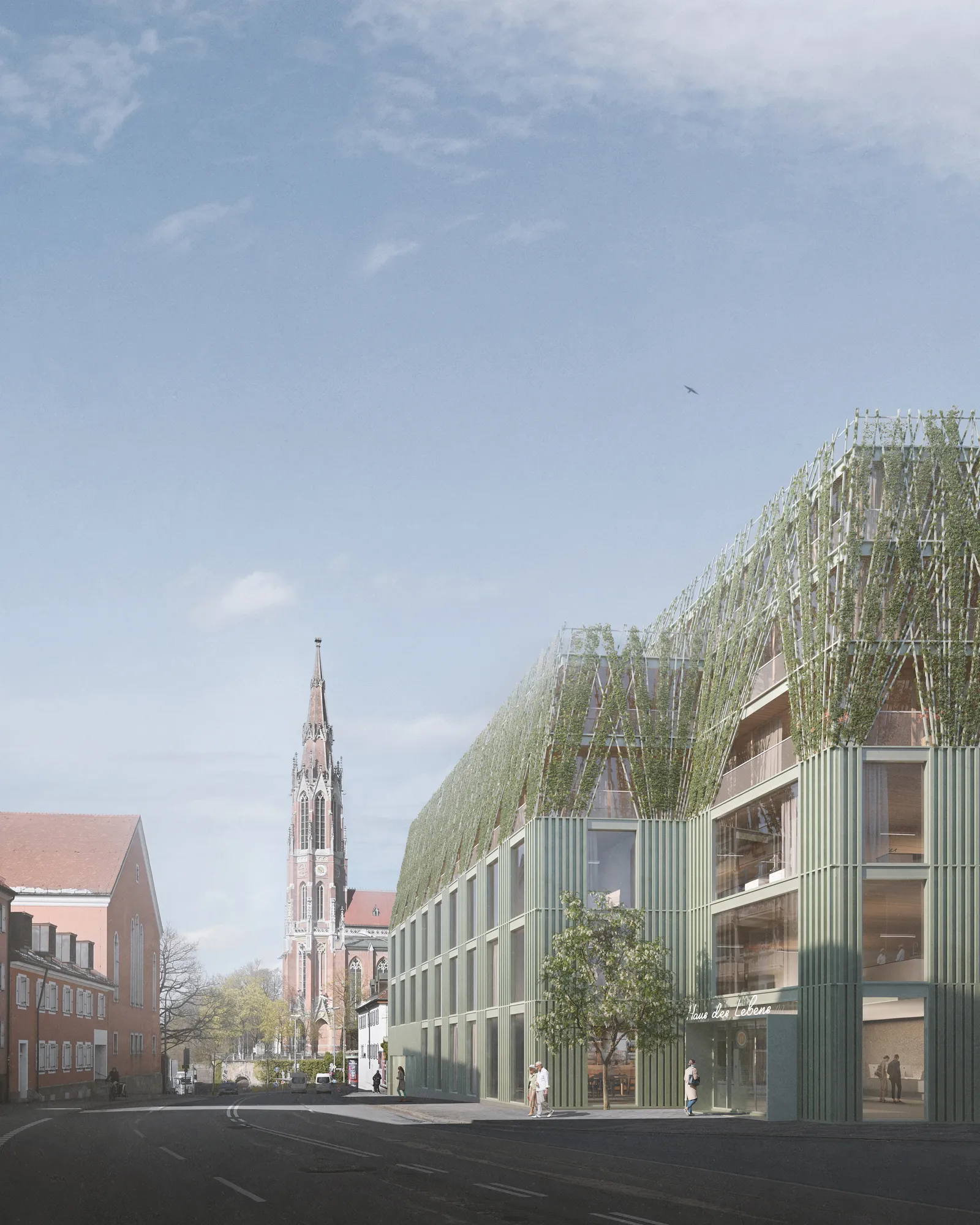 The “Haus des Lebens” (House of Life) hospice is to be built at the corner of Martin-Luther-Strasse and Weinbauernstrasse in Munich’s Giesing district. The area surrounding the site is quite diverse with different building densities and heights, different architectural eras, roof lines and features as well as a listed heritage building to the east and a two-story farmhouse to the north. Our design for the new build seeks to reconcile, and not just in terms of the urban context. It proposes a new type of hospice, one which is front and center in our society and a fixture of everyday life, embedded within the neighborhood in a way that is welcoming and evident yet also sheltered and private.