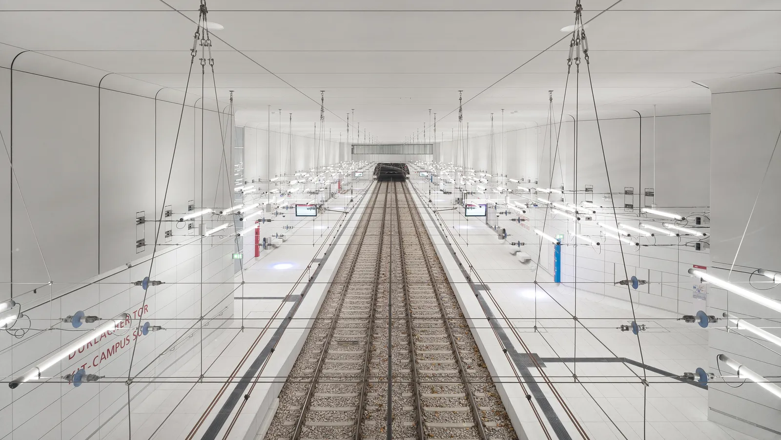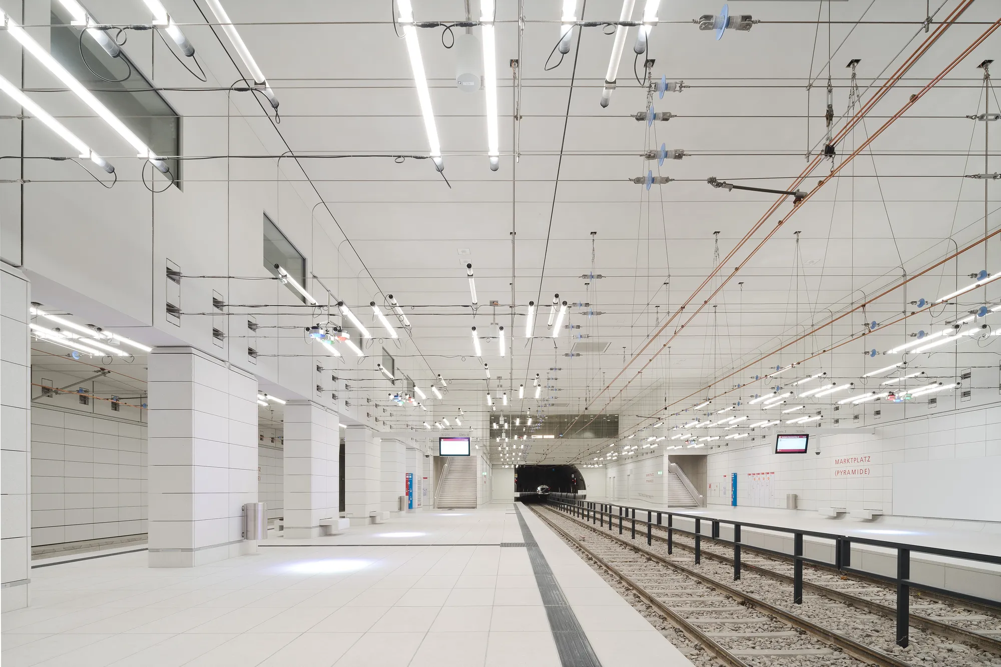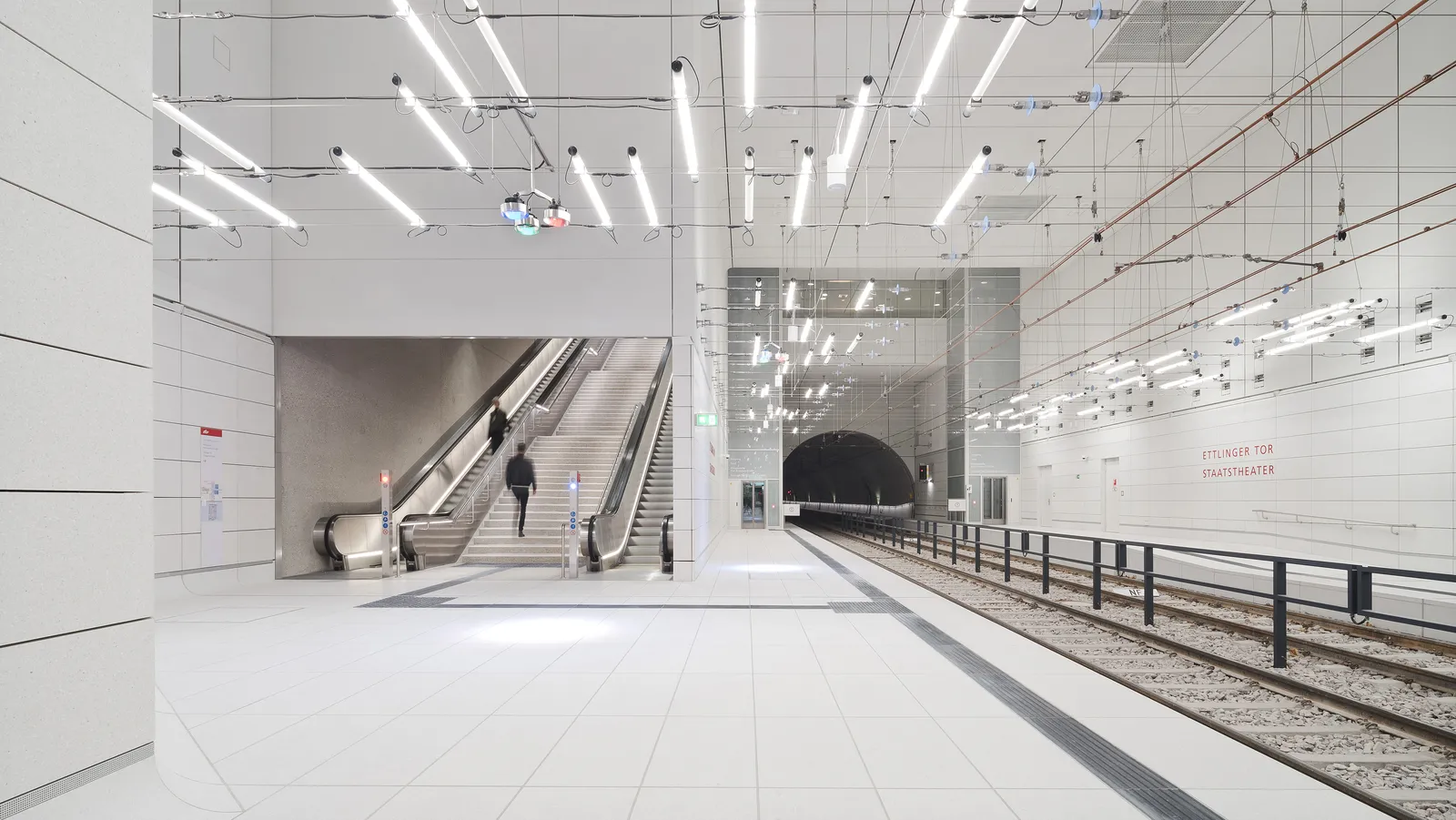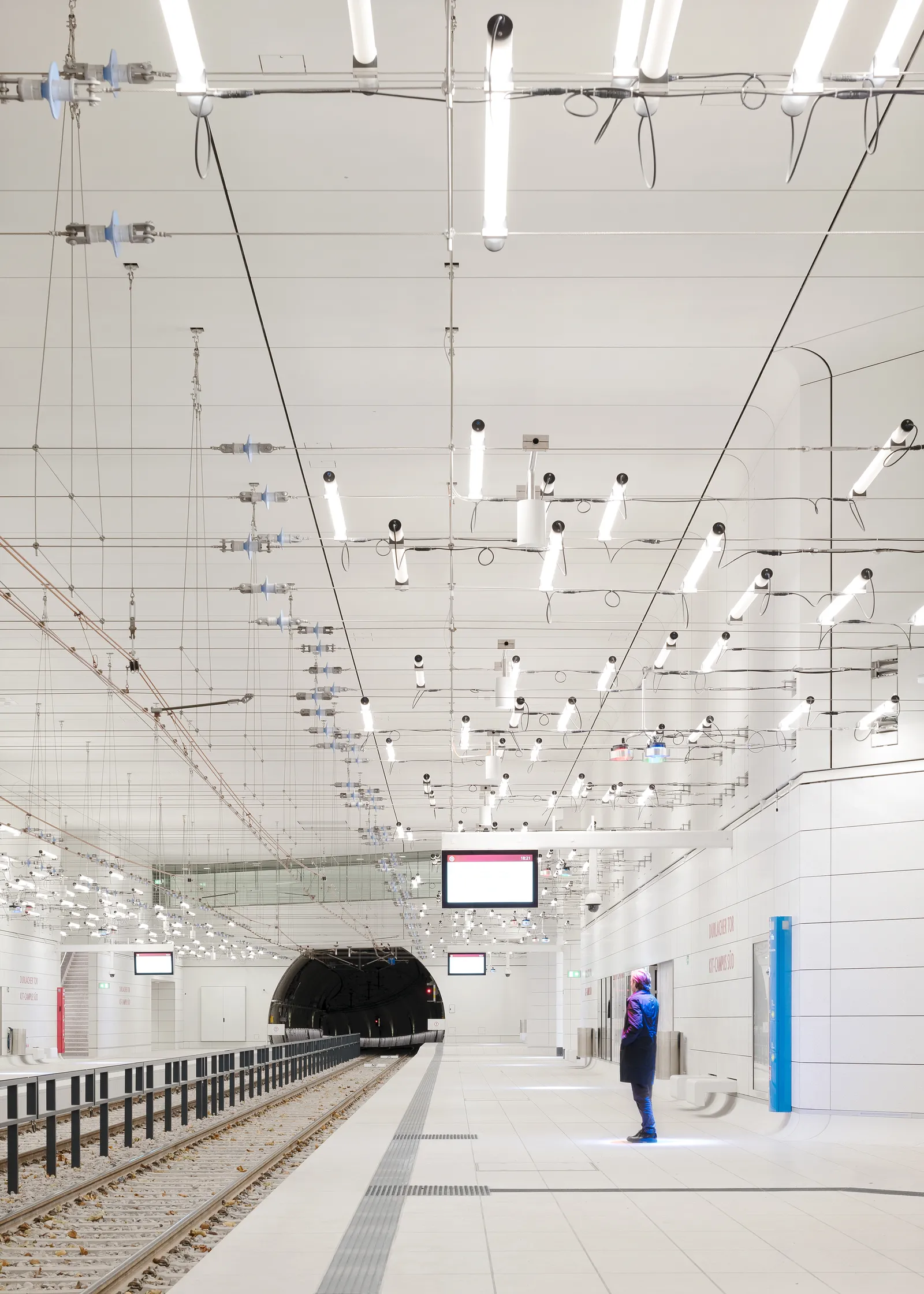 A key design element is the lighting concept created by Ingo Maurer. Reflecting the necessary suspension of the overhead power lines, a steel cable construction runs freely through the space. Arranged in three cables side by side and two above each other, the lighting construction appears – depending on the passengers' viewing angle – like the subtly arranged notes of a symphony. Integrated into this are LED lights, which enliven the station area with their shape and distribution and make electricity tangible. Individual lights create coloured shadows as effect lighting. Passengers and trams are isolated as actors on the bright background and atmospherically staged by the light. www.ingo-maurer.com