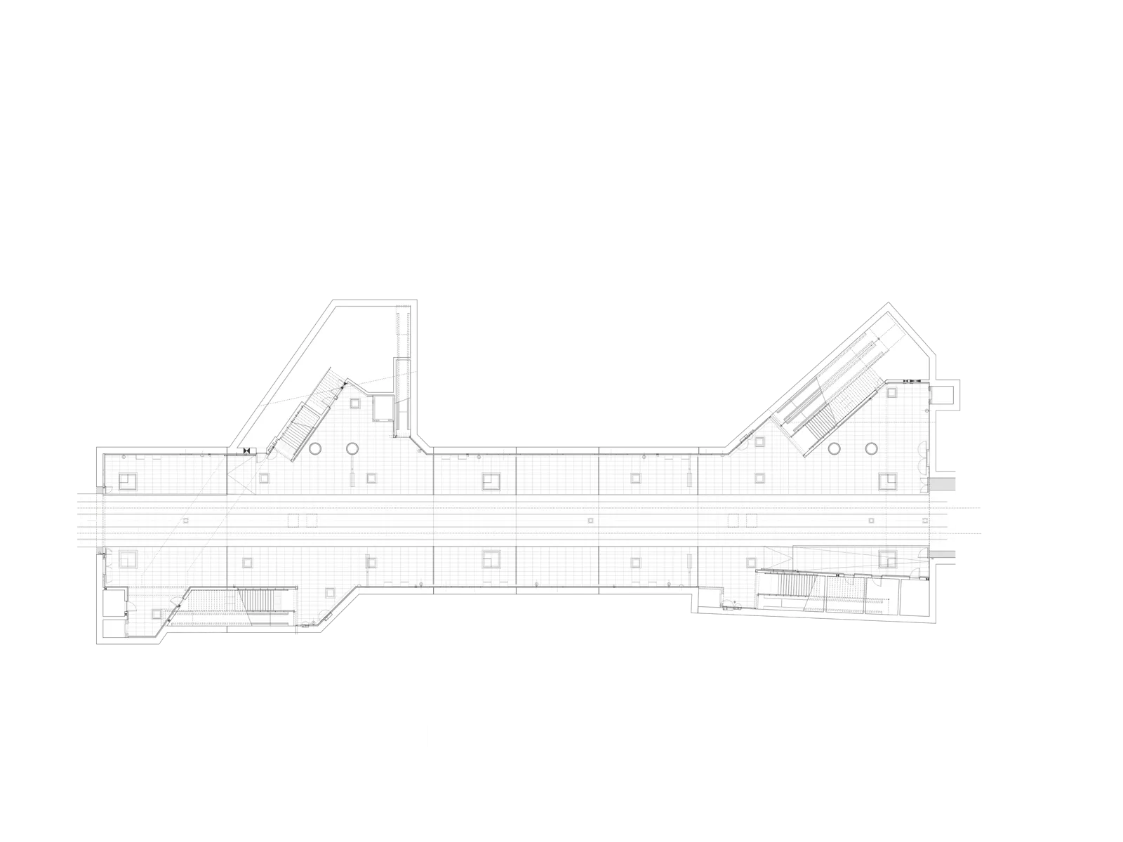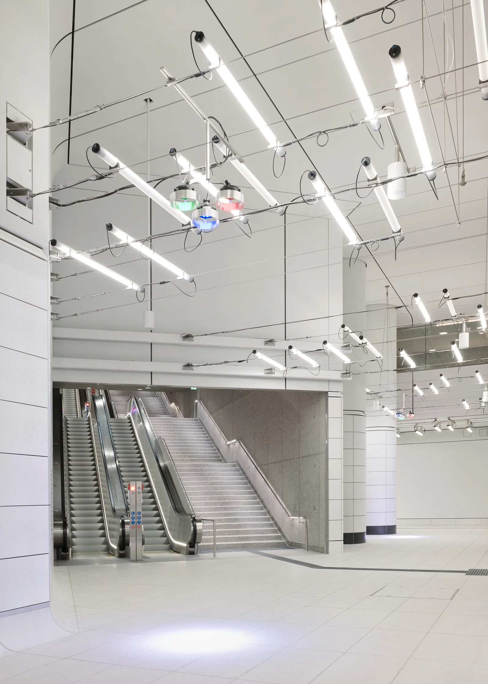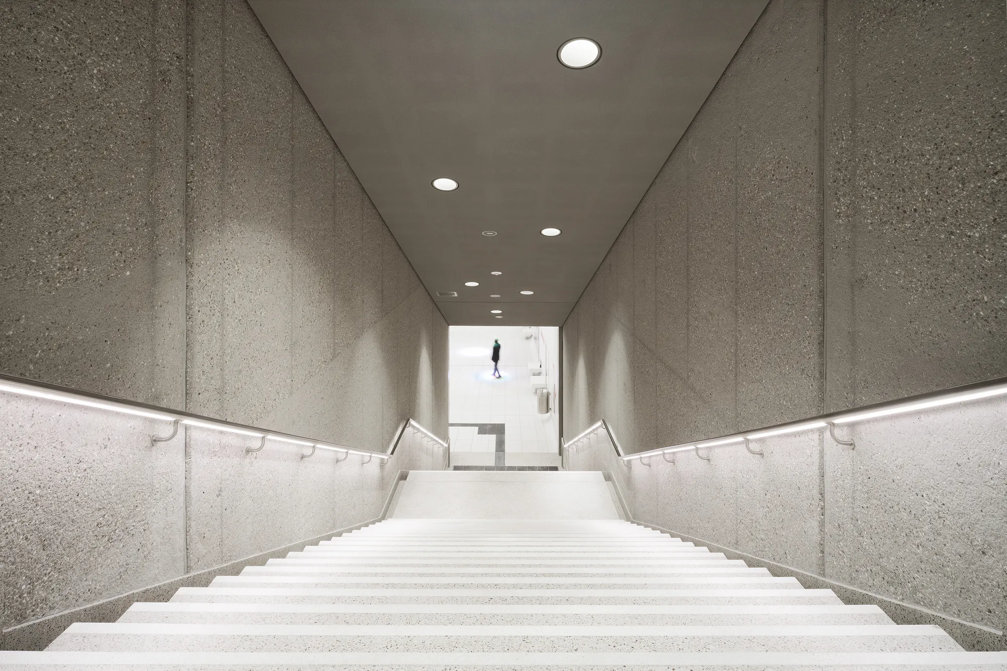 This gives each station a distinct character and high recognition value, which allude to the exterior location. By practicing restraint in the formal design of the spaces, the design underscores the symbolic character of each station structure. The concept defines two categories of space, each governed by its own design principles. In the transfer zone with stairways and mezzanine floors, the design leaves the underlying structure exposed and without cladding.