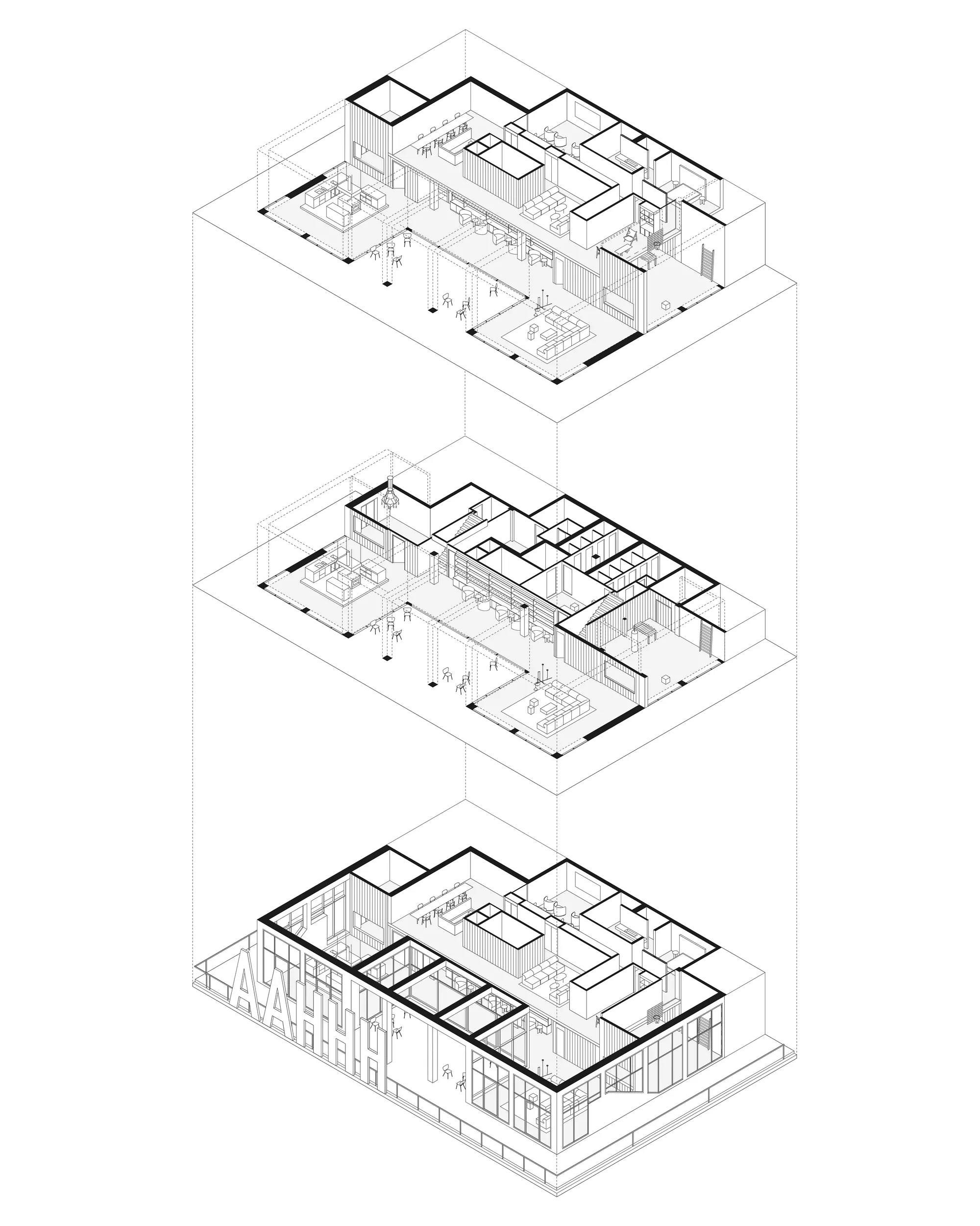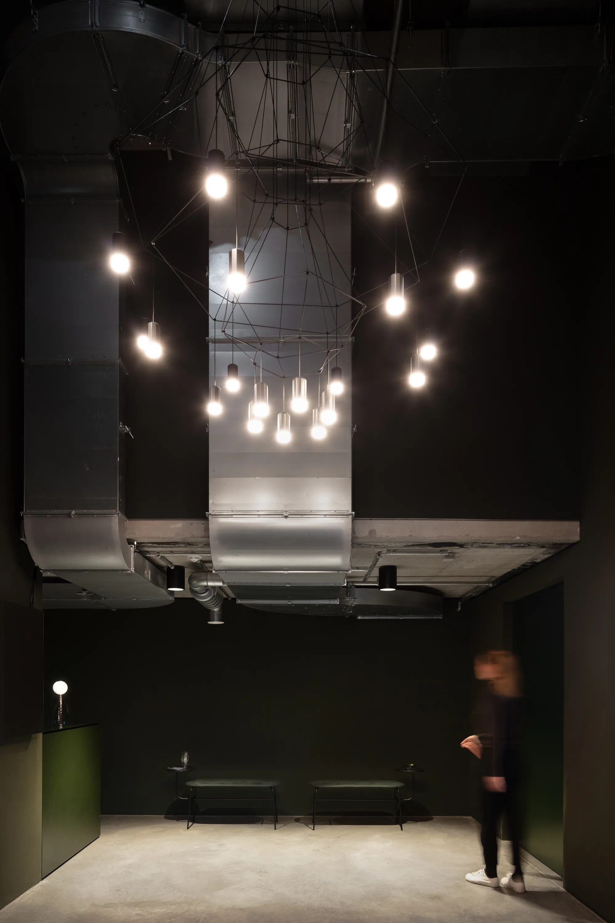 The simultaneous experience of vastness and limitation, openness and confinement is continued thematically in the furnishings, which can be flexibly positioned to enable various usage scenarios. The floor, walls and ceiling are understated in colour and material, forming the backdrop for actors and props.