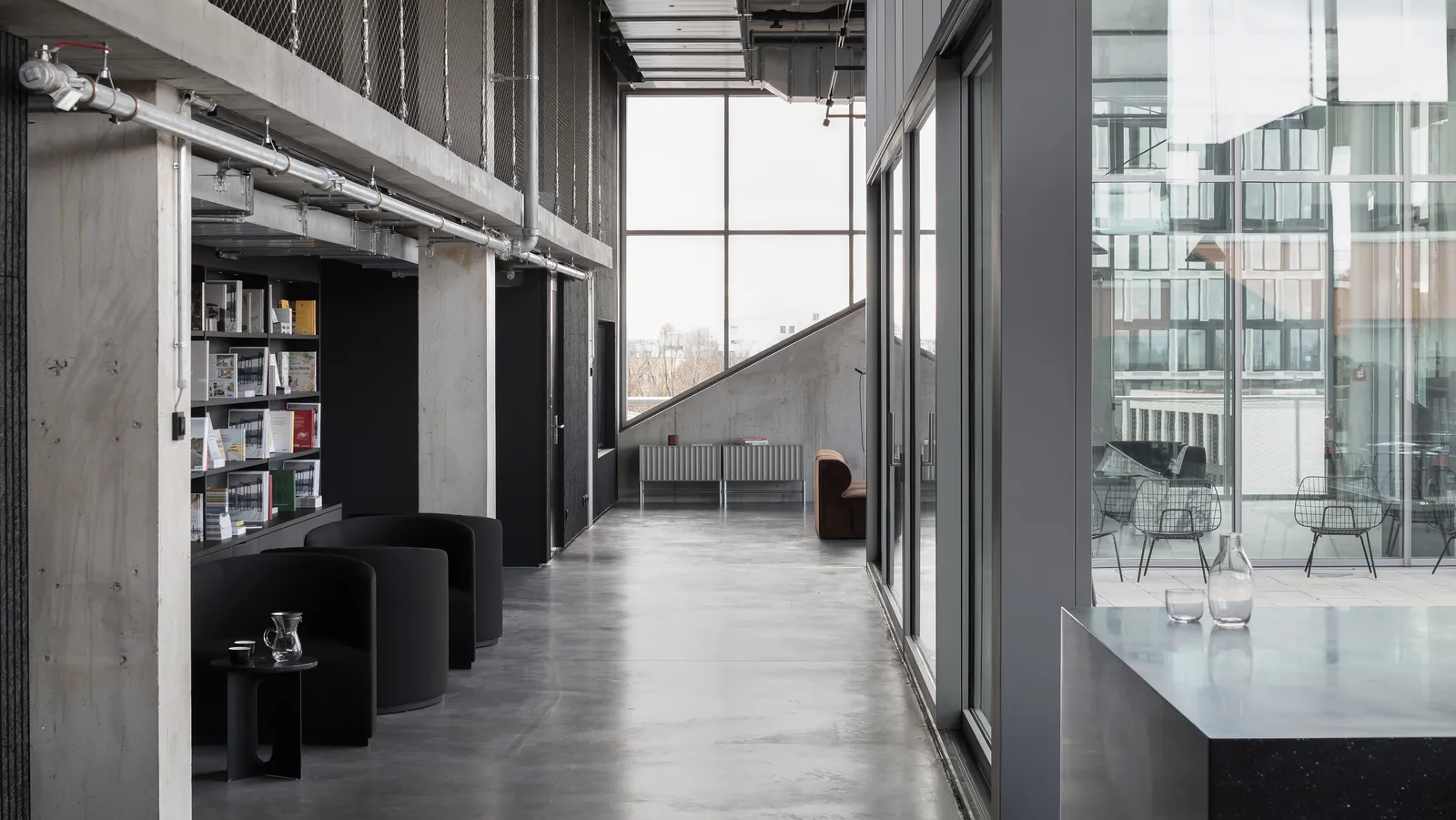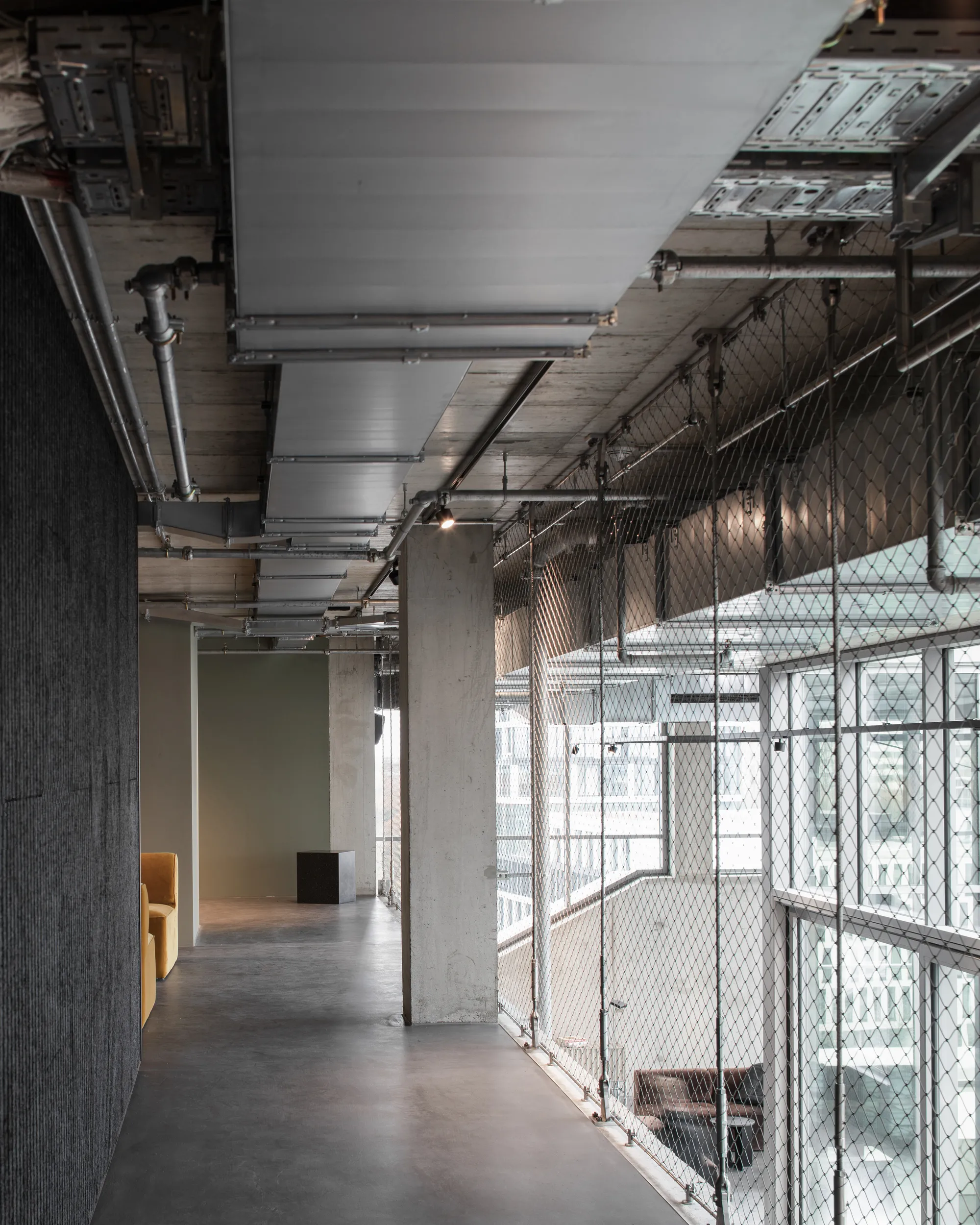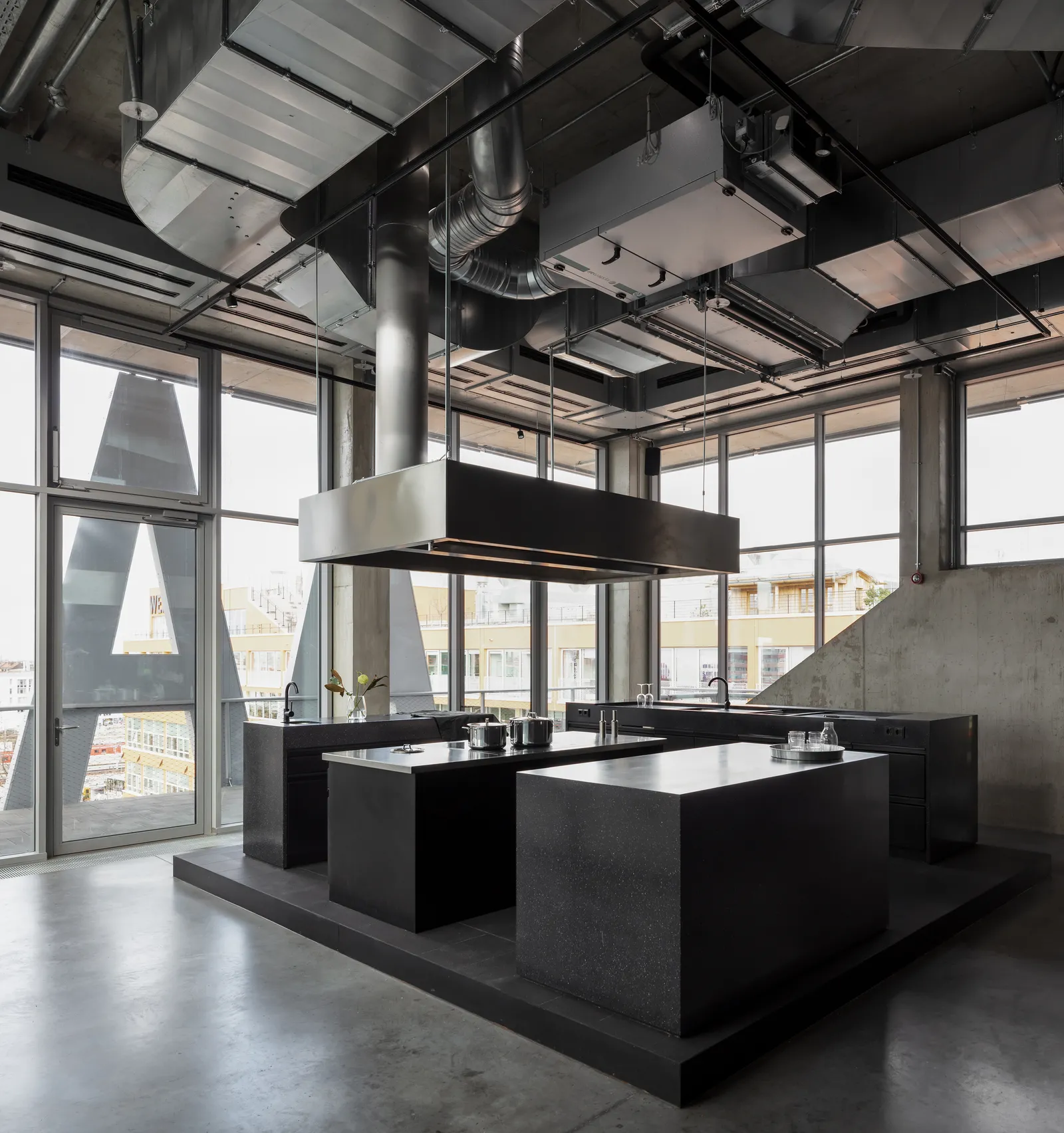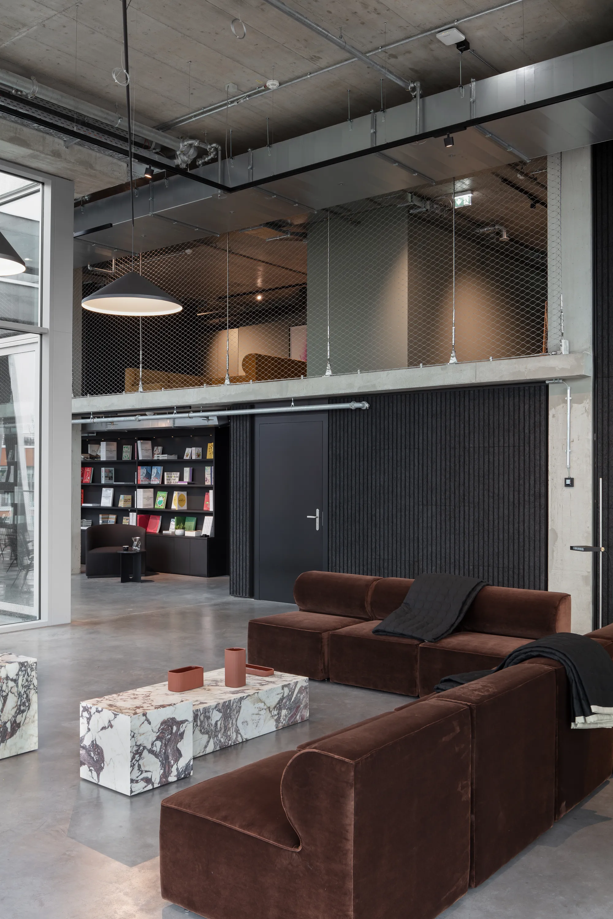 nother panoramic window from room to room reveals the studio space, which is set up as a home gym. A basketball hoop and wall bars await their users. Alternatively, there are two staircases that lead up to the mezzanine level. The lower room height creates an intimate space for concentration and retreat. A co-working space and a cinema-style presentation space are situated side by side as well as a small lounge and music room. At the back there is a comfortable bedroom with an ensuite bathroom: The penthouse becomes “John’s Apartment”.