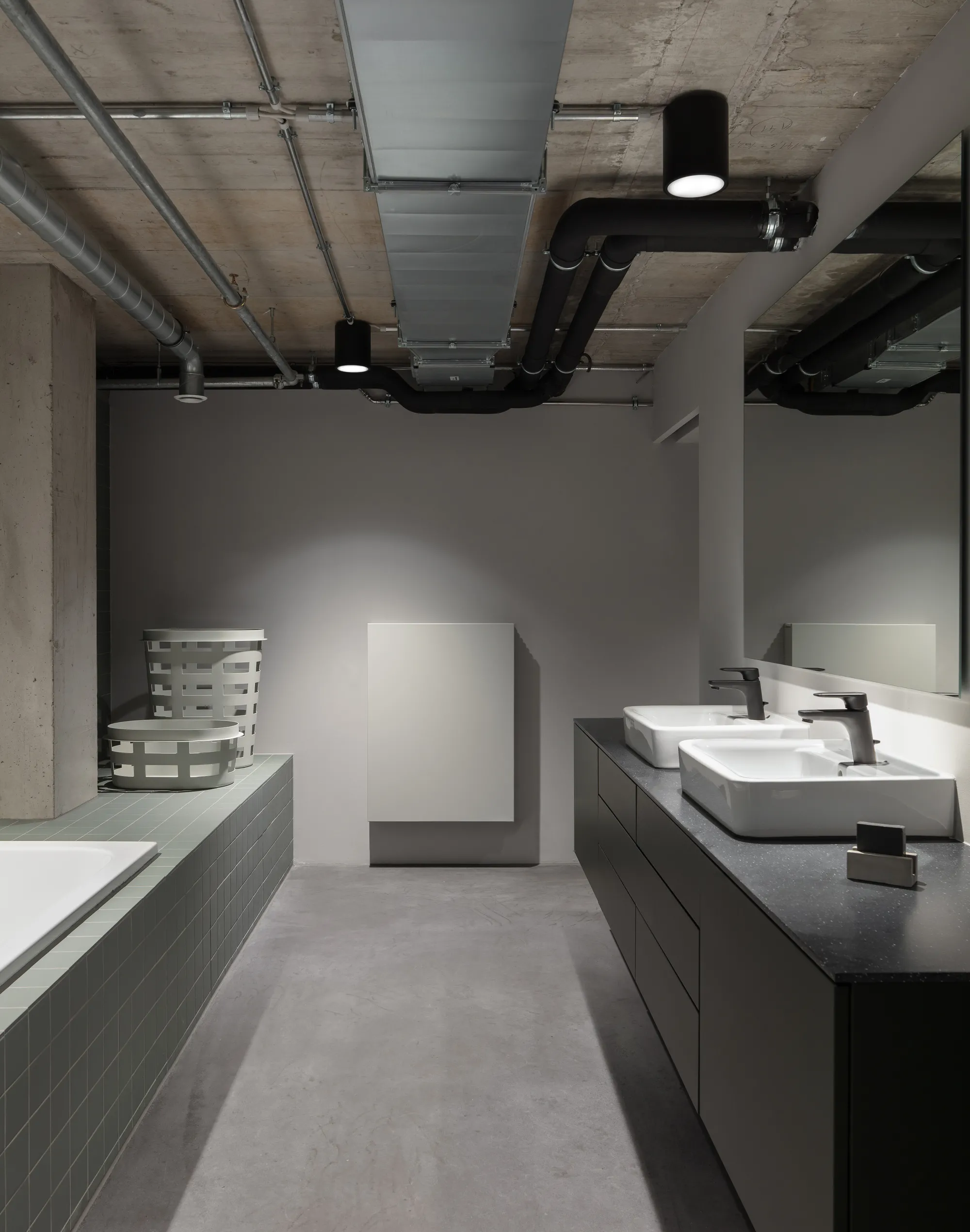 Werksviertel-Mitte district in Munich. Welcome to “John´s Penthouse”: a two-story loft occupying the fifth and sixth floor of the Werk 12 building designed by MVRDV. A refined structural shell with all installations on display, the Penthouse sets the stage for a variety of uses and cleverly combines the public with the private. After the client and the architect first met on Instagram, they agreed that specifying very little while making almost everything possible was both the brief and the solution. The chronology of the spaces, the intentional transitions and zooms allowed us to structure seemingly arbitrary spaces in a sustainable, user-friendly way and create an architectural rendering of the concept of networking.
