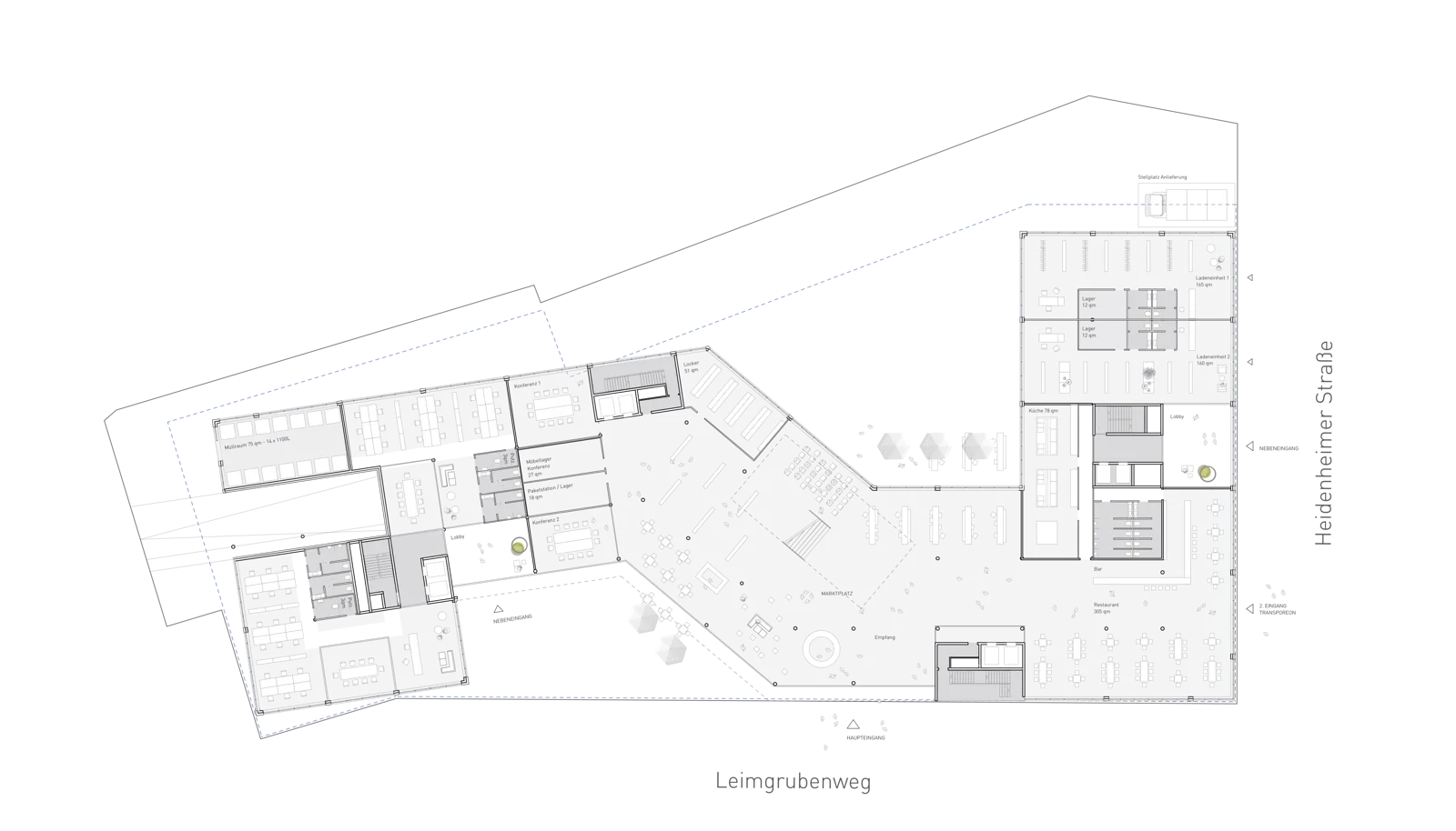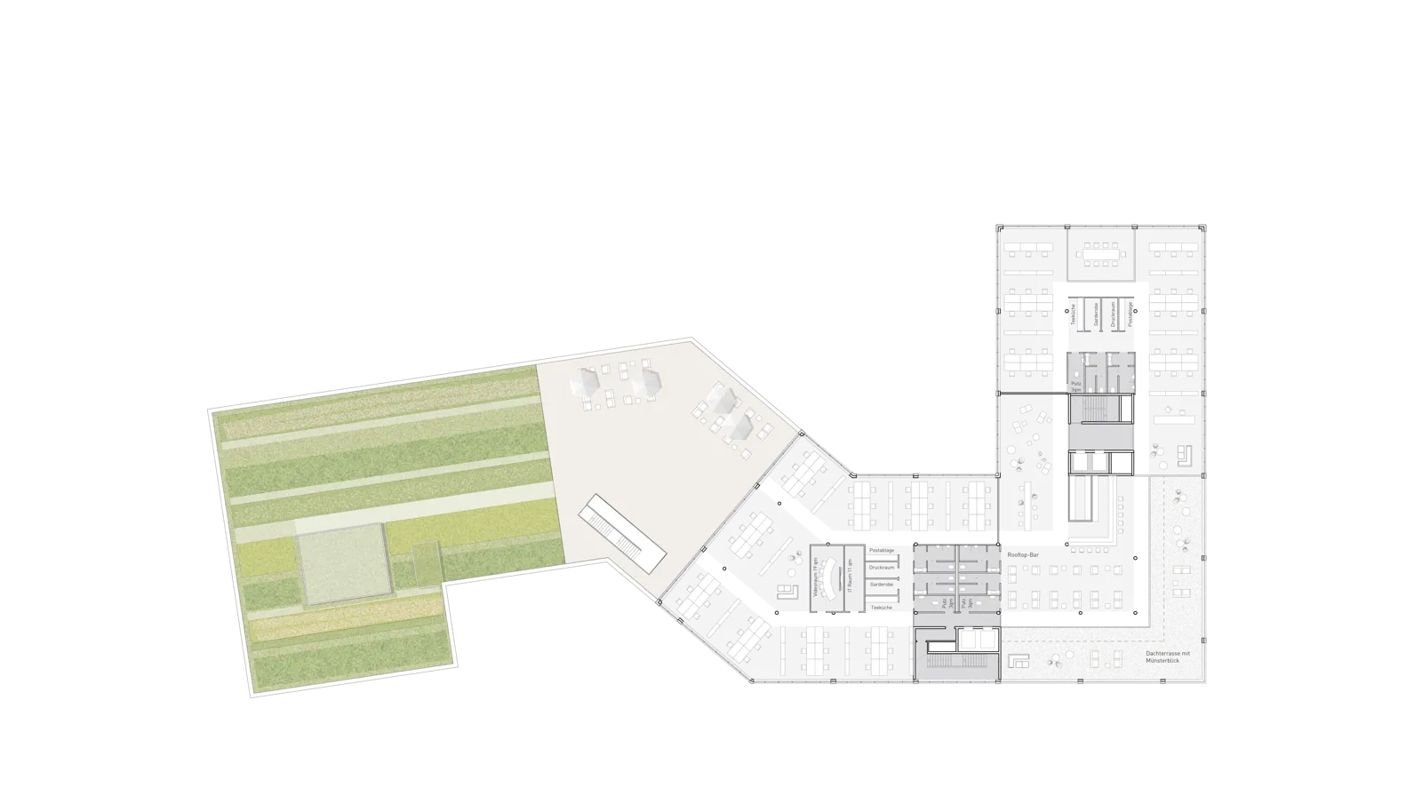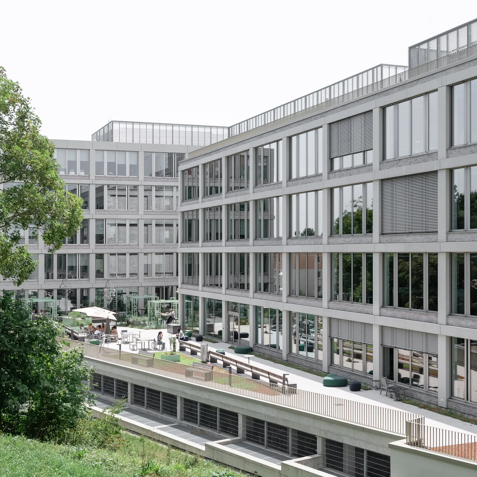 The roof, conceived as a fifth façade, serves as an extended outdoor space, offers views of Ulm Minster, and also forms an attractive counterpart to the neighboring buildings situated higher up the slope. The building volume integrates harmoniously into the site, which is characterized by varying height contours. As a continuous band, it connects the surrounding green spaces with the plot. It defines a central entrance area; ground-floor retail units contribute to the long-term activation and vitality of the site.