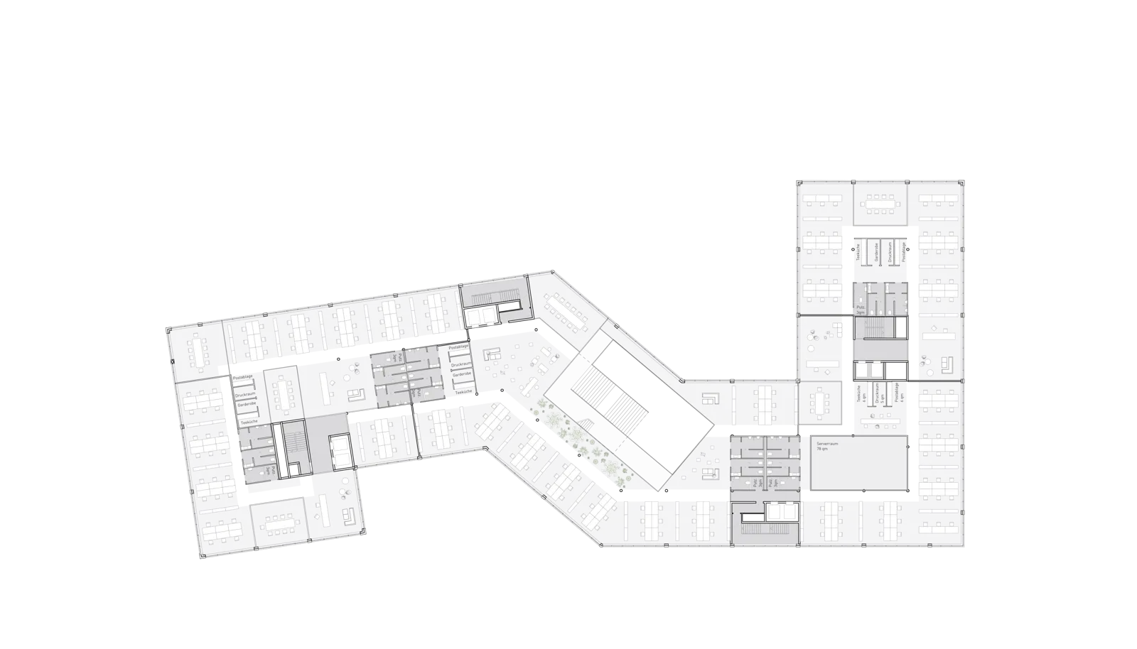The architectural concept is based on the principle of spatial networking. An open market square on the ground floor connects the open spaces and serves as a social centre for guests and employees. Focused work, learning and collegial collaboration are also visible from the outside.
